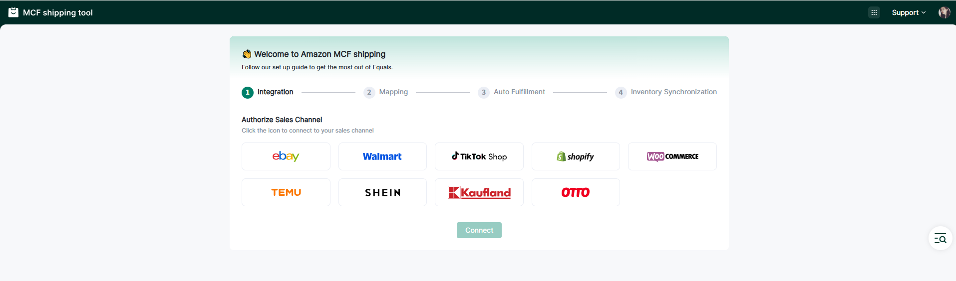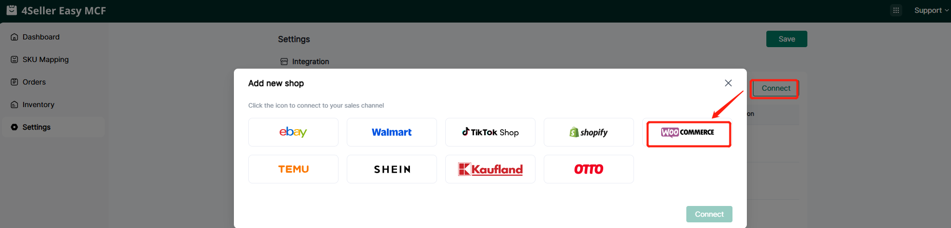 Entrance 1: On the guide page, if you are a new user, you can set up your Sales Channel in the MCF guide Wizard , and click the Woocommerce Store icon to enter the store authorization page.