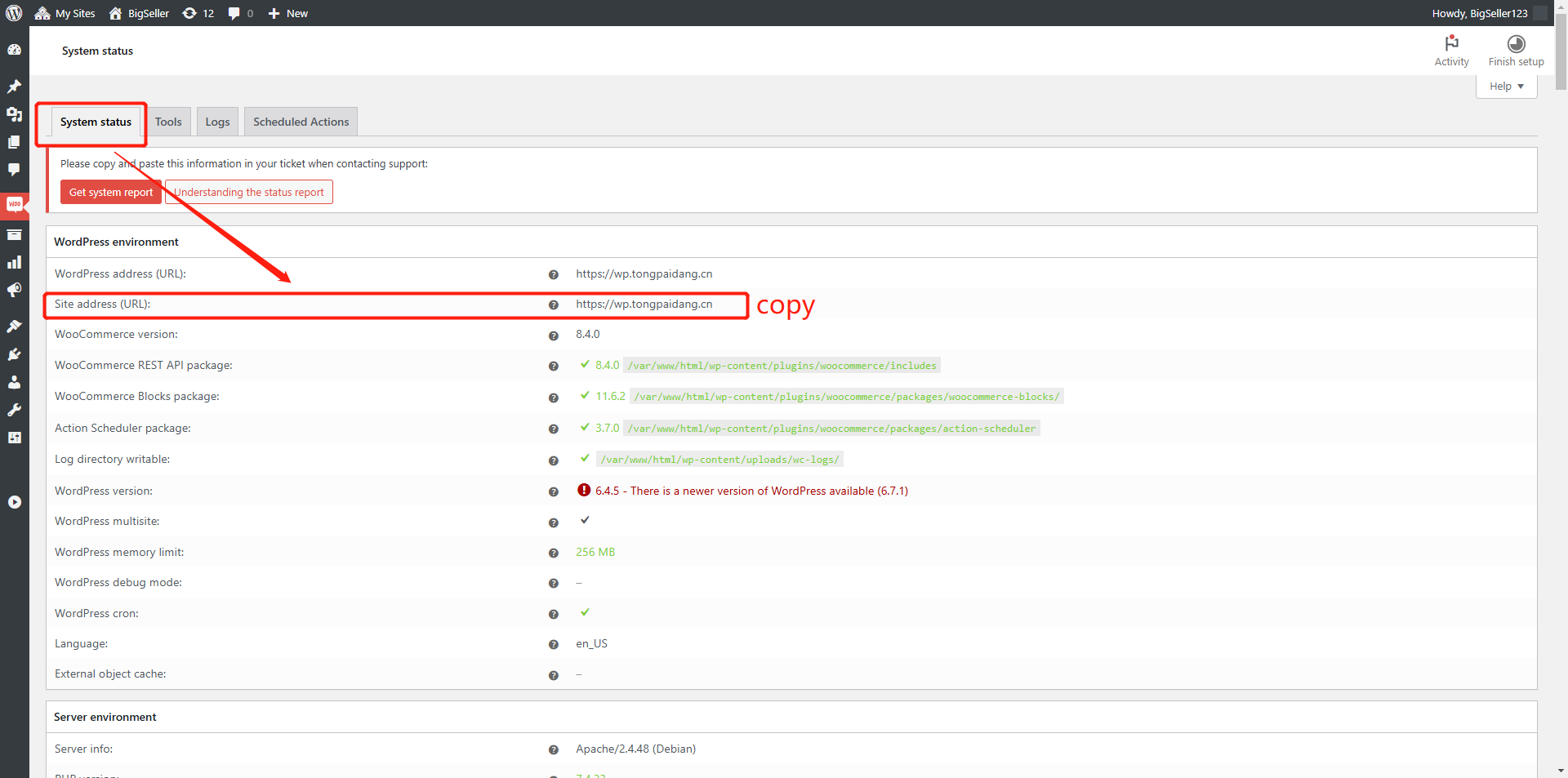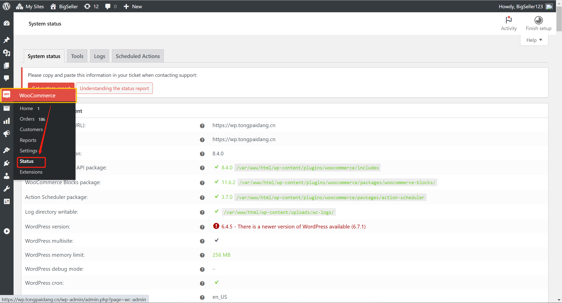 1. 【Log in Woocommerce—Status—System Status—Site Address URL】