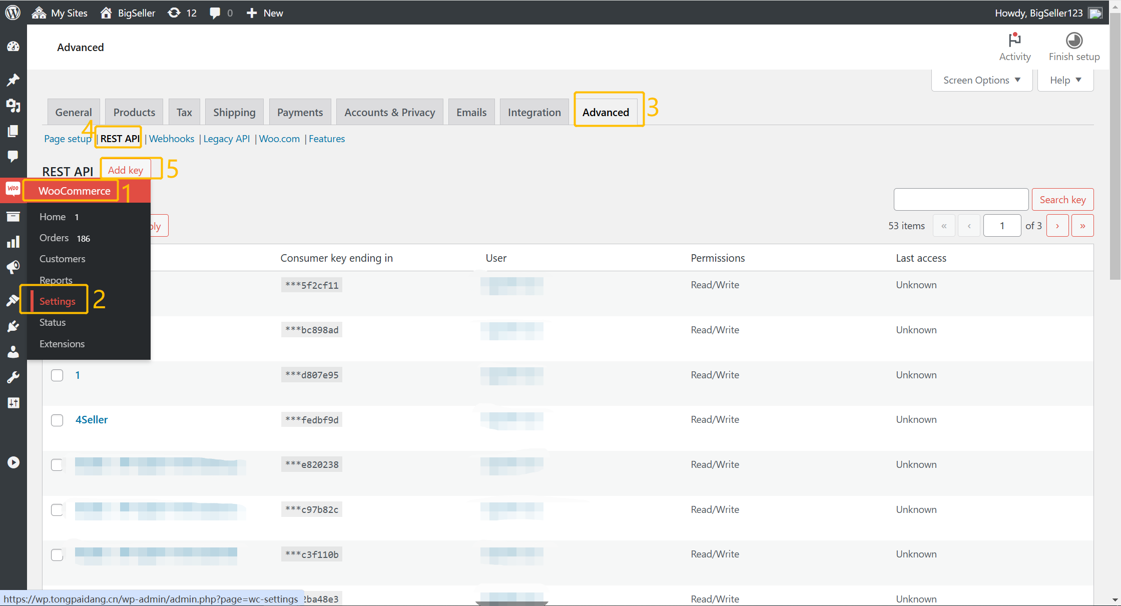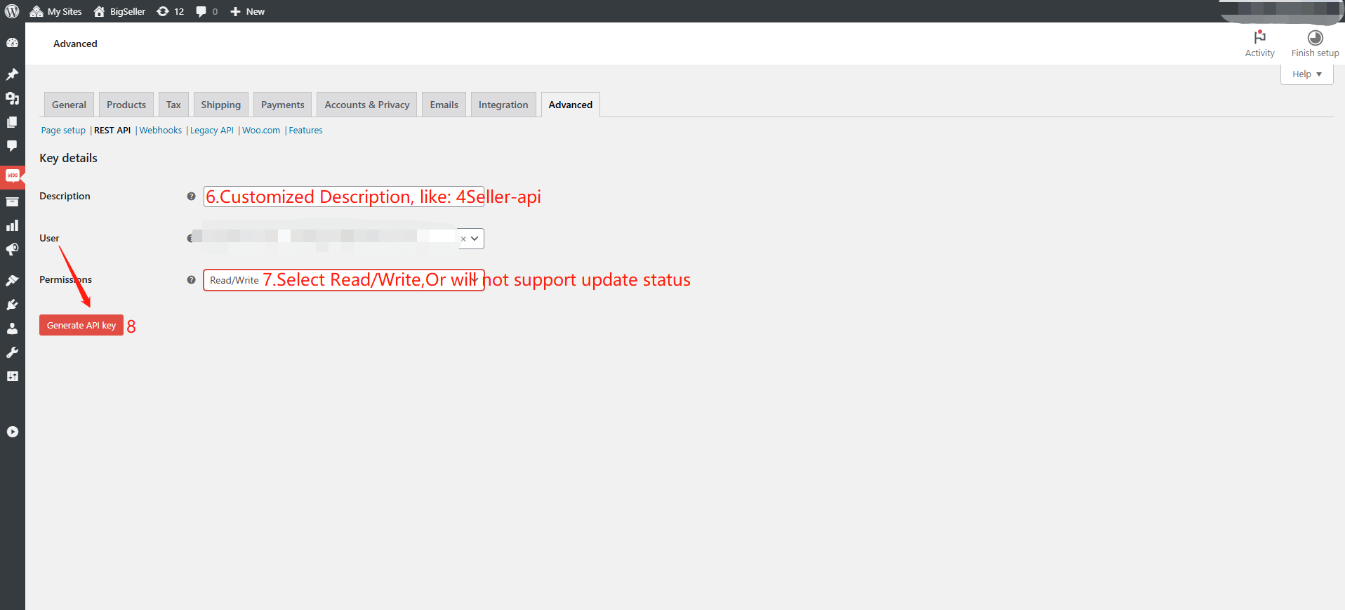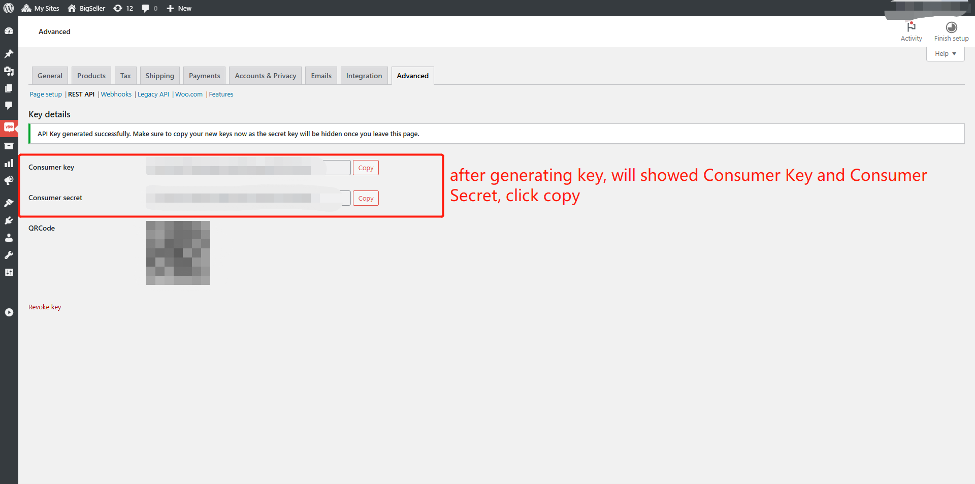 2.【Woocommerce Platform—Setting—Advanced—Add Key—Generate Consumer Key and Consumer Secret】