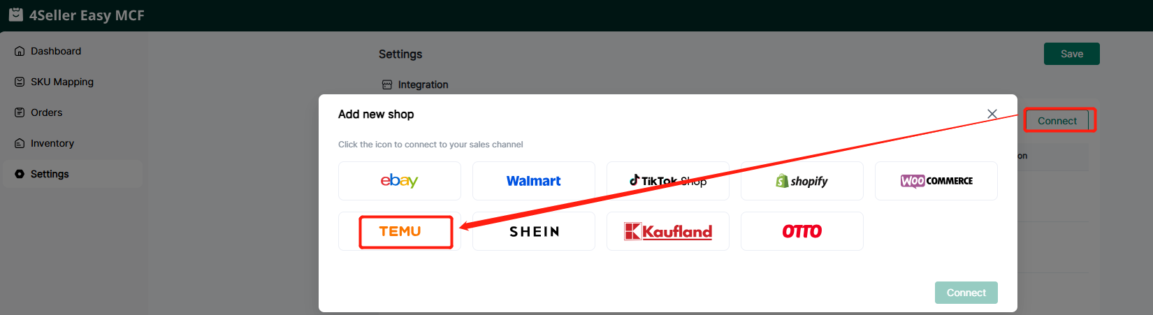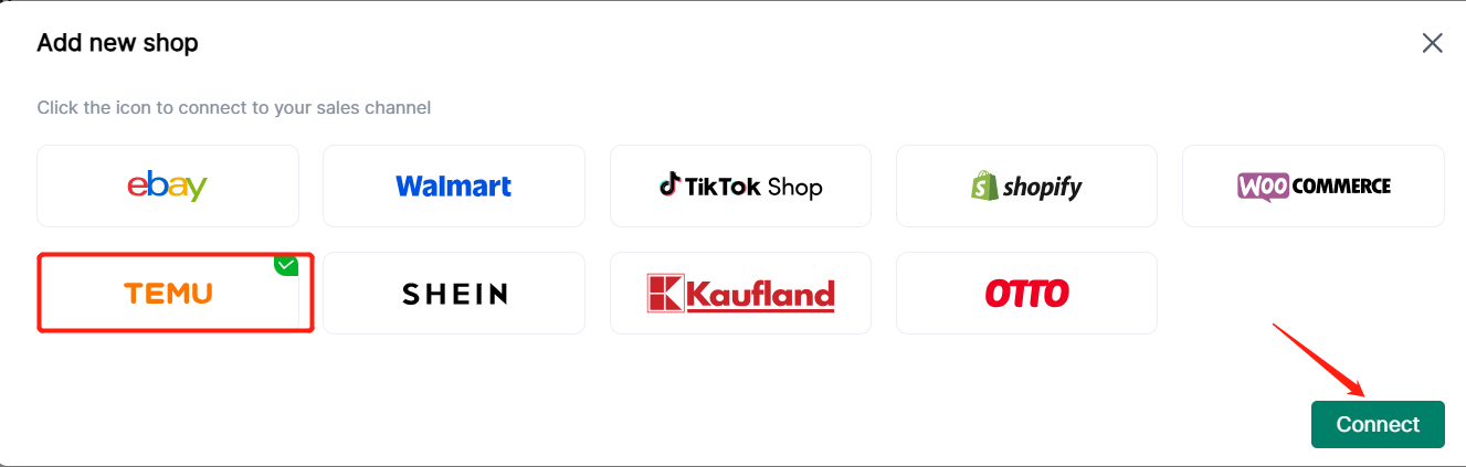 Entrance 1: On the guide page, if you are a new user, you can set up your Sales Channel in the MCF guide Wizard , and click the TEMU store icon to enter the store authorization page.