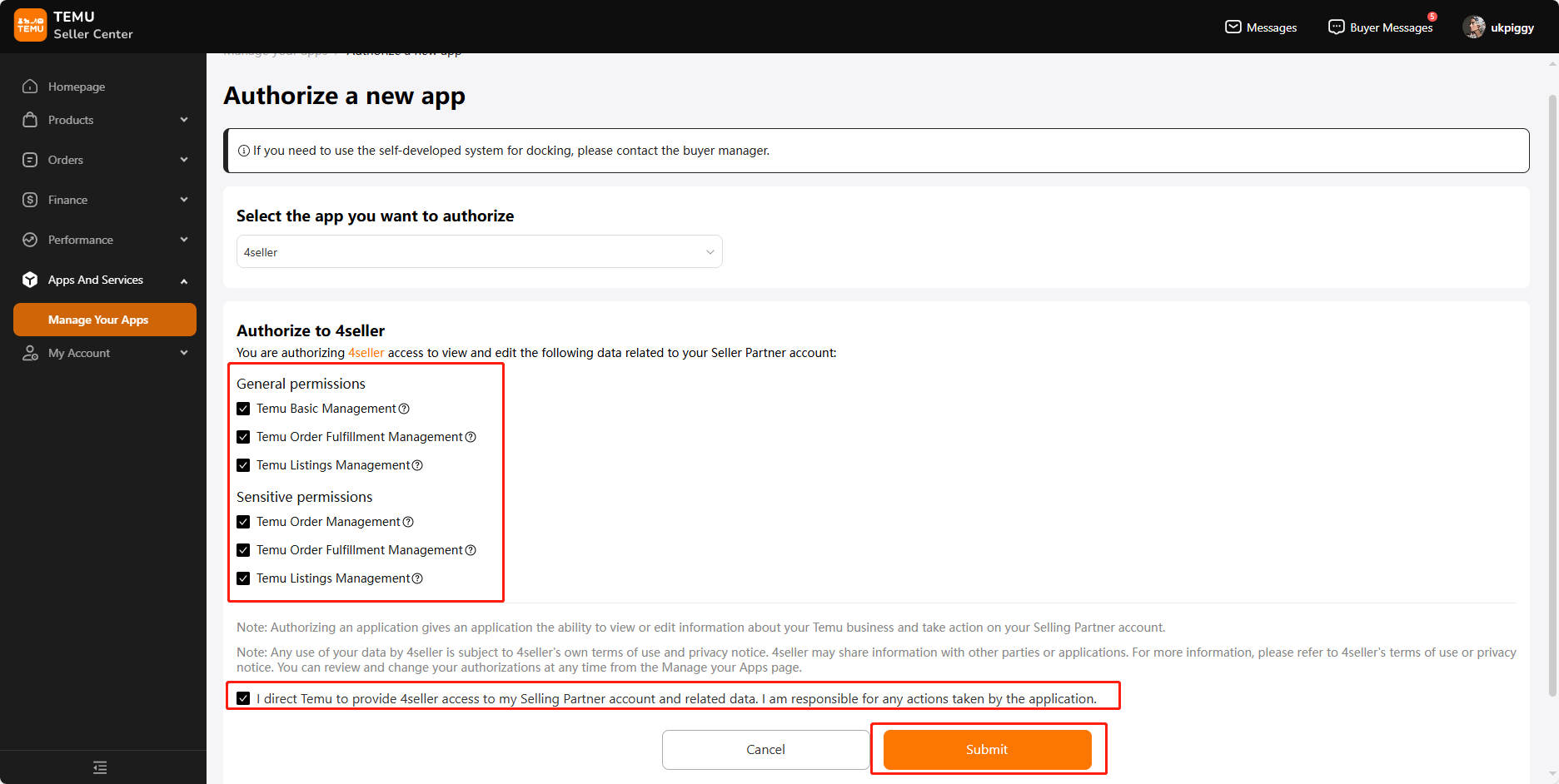 2. After selecting 4Seller, check all permissions, click "i direct Temu to provide 4Seller access to my Selling Partner account and related data. I am responsible for any actions taken by the application." below, and click "Submit".
