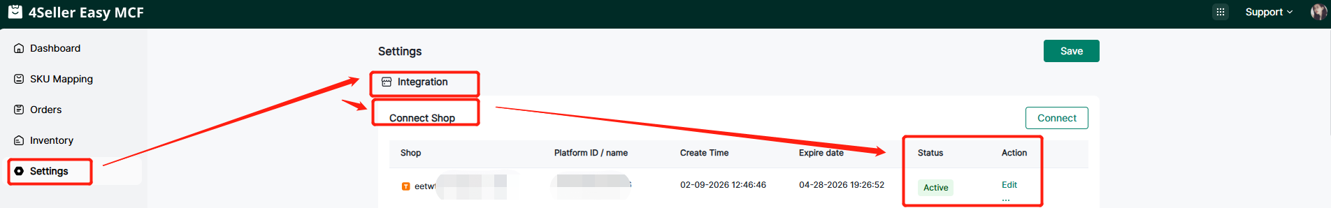 Step 4: After connect successfully, you can go to the setting page "Connect Shop" for checking status and edit.