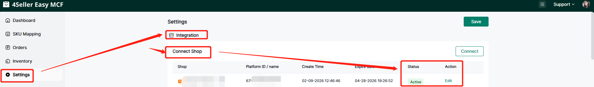 Step 5: After connect successfully, you can go to the setting page "Connect Shop" for checking status and edit.