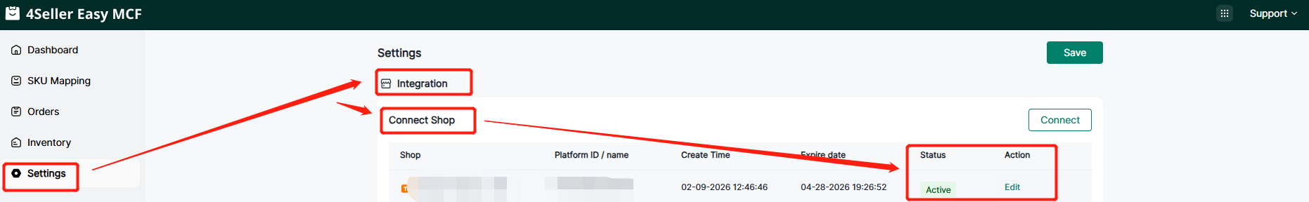 Step 3: After connect successfully, you can go to the setting page "Connect Shop" for checking status and edit.
