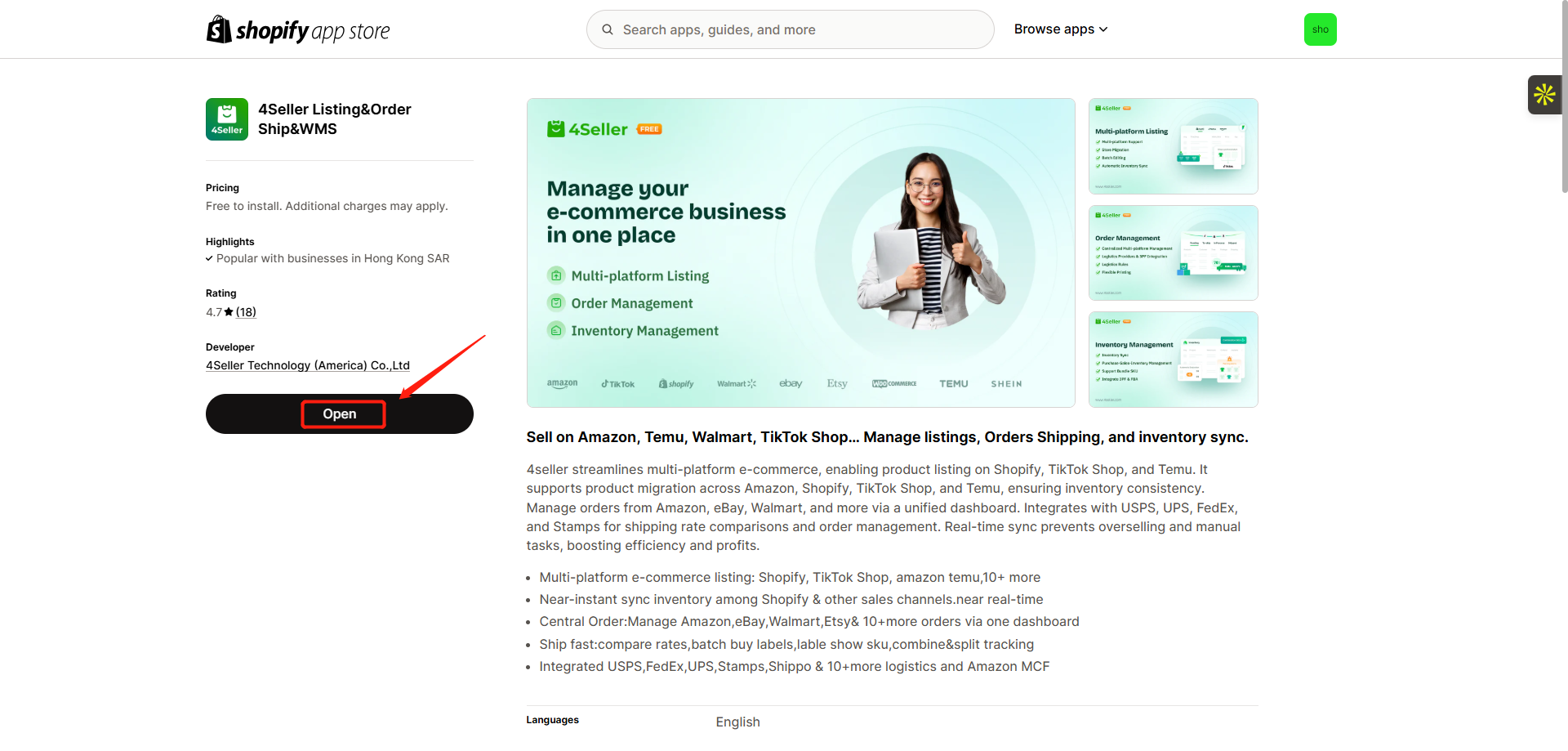 After entering the Shopify app store page, you can click open to log in to your Shopify account (if you have already logged in to your Shopify account, you can ignore this step)