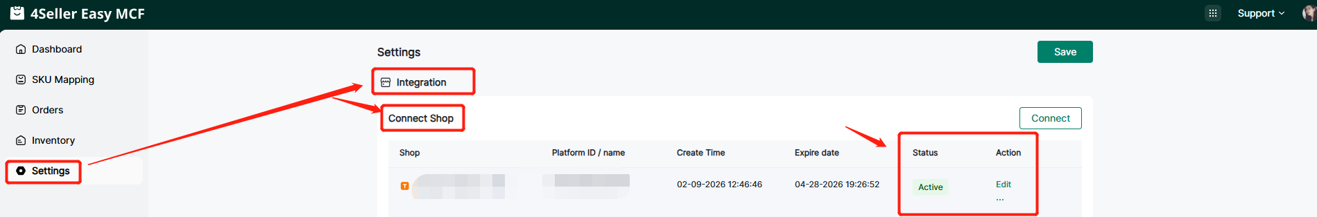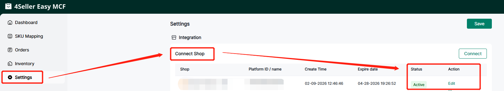 Step 2: After connect successfully, you can go to the setting page "Connect Shop" for checking status and edit.