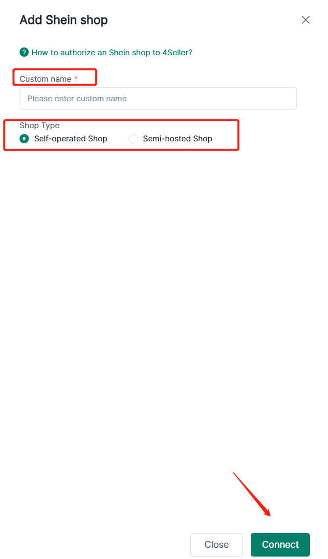Step 1: Enter Fill information page to fill custom name--Select Shop Type--Click Connect