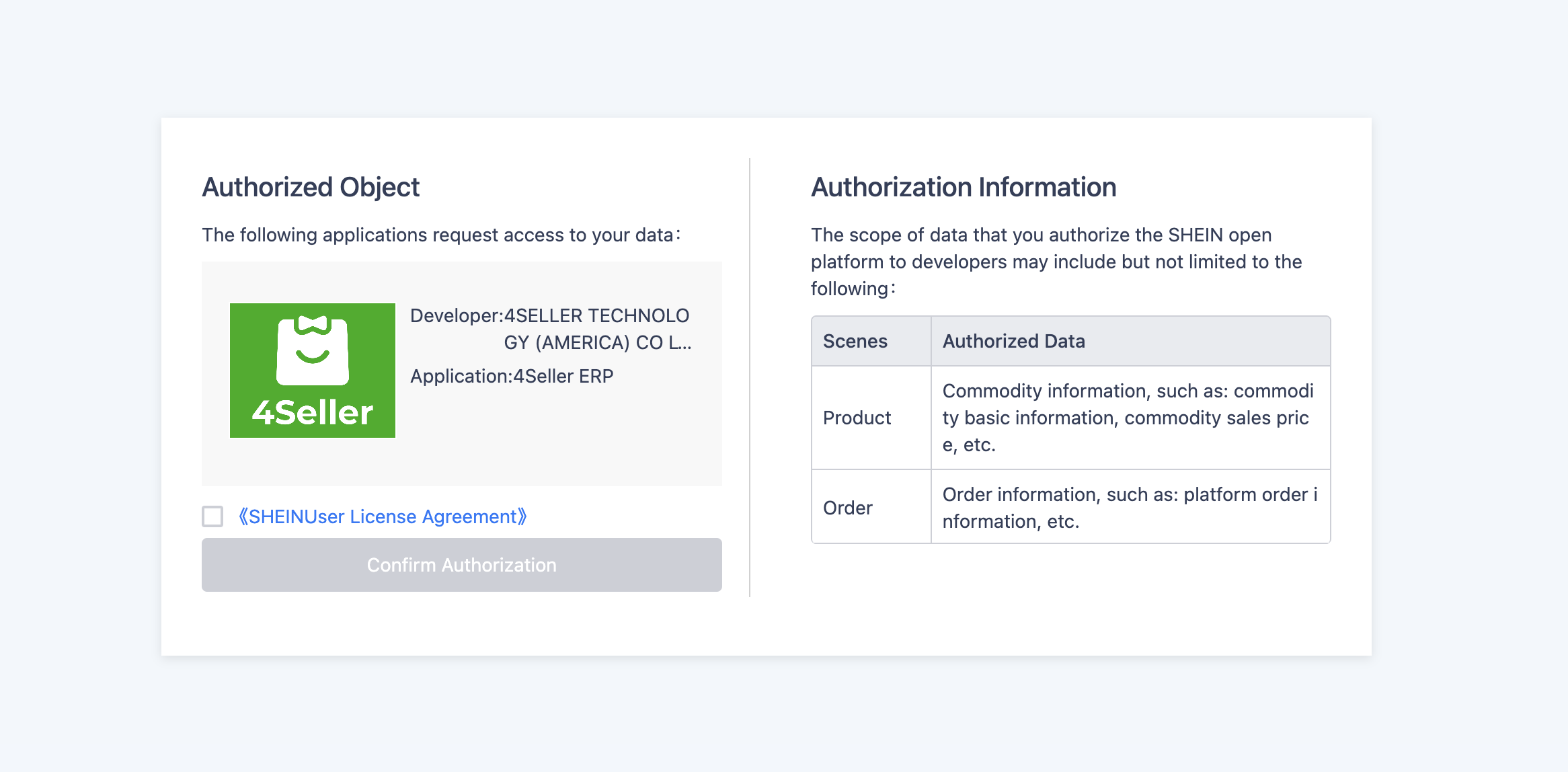 Step three: Click "Comfirm Authorization" to connect Shein shop to 4Seller