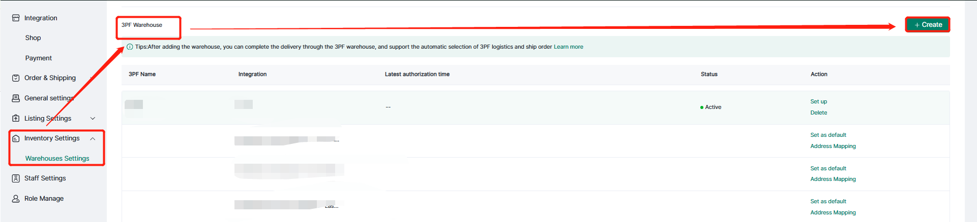 2. Setting--Inventory Settings--Warehouse Setting--3PF--Create