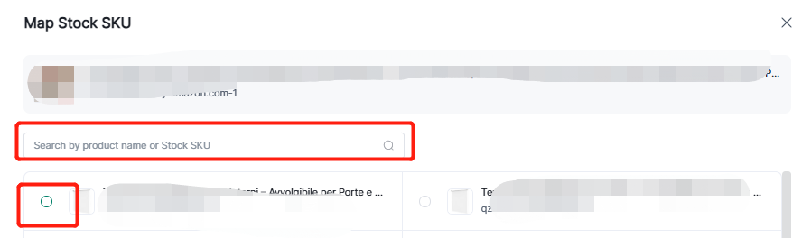 On the Map Product page, you can search by product name and SKU, then select the corresponding product and click Select to match the SKU of the inventory.