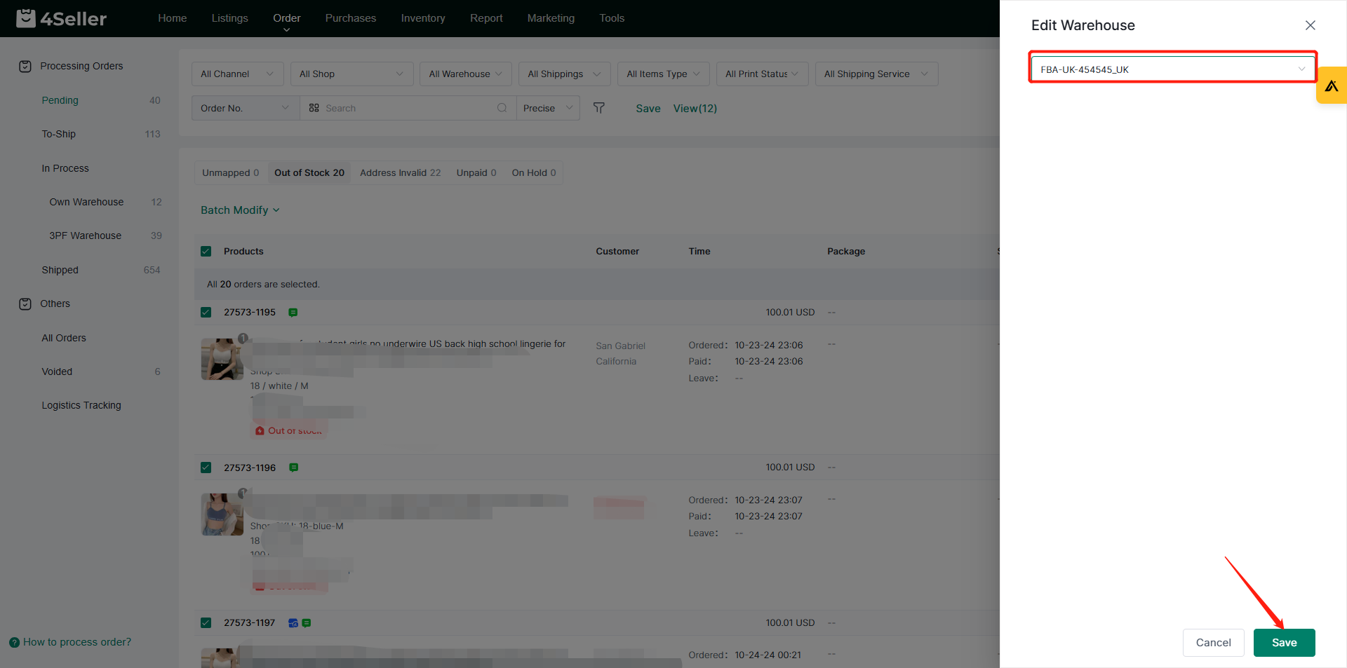 On the Edit Warehouse page, you can select the corresponding FBA warehouse, and then click Save to update the order's shipping warehouse in batches.