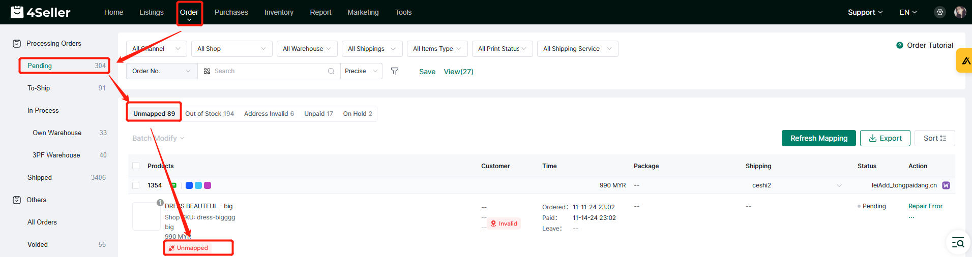 Orders in the Pending status are mainly due to four reasons: no mapping of SKU, out of stock, invalid address, unpaid and on hold.