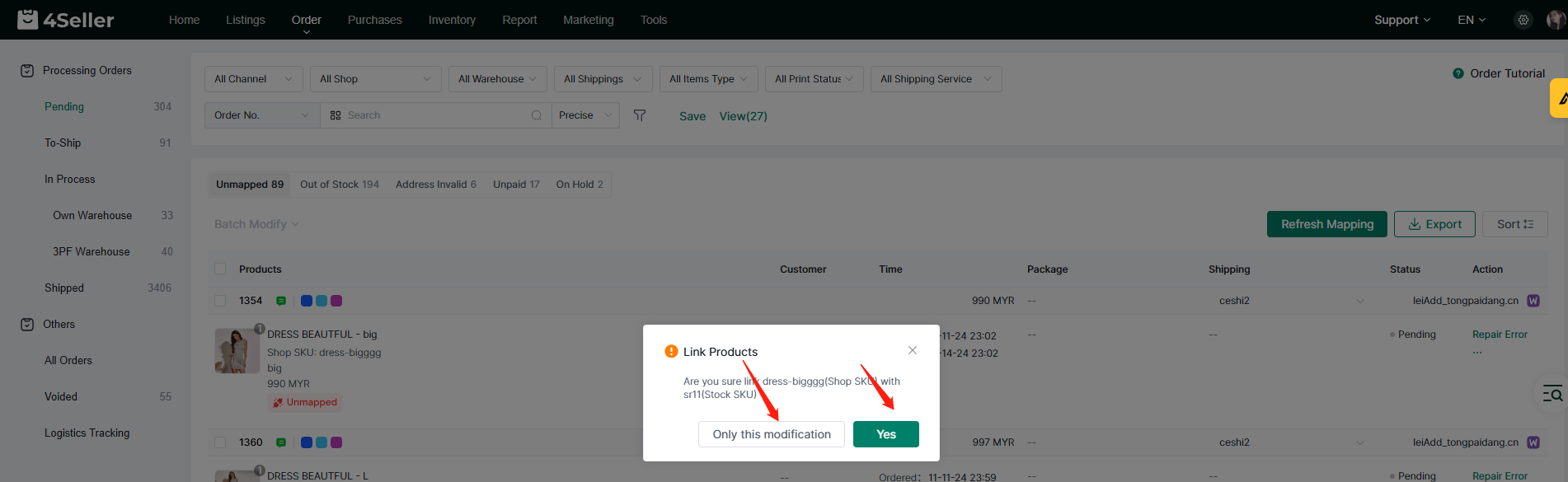 (1) When the order appears in Unmapped, you can click the Unmapped icon and select the corresponding SKU for matching.
