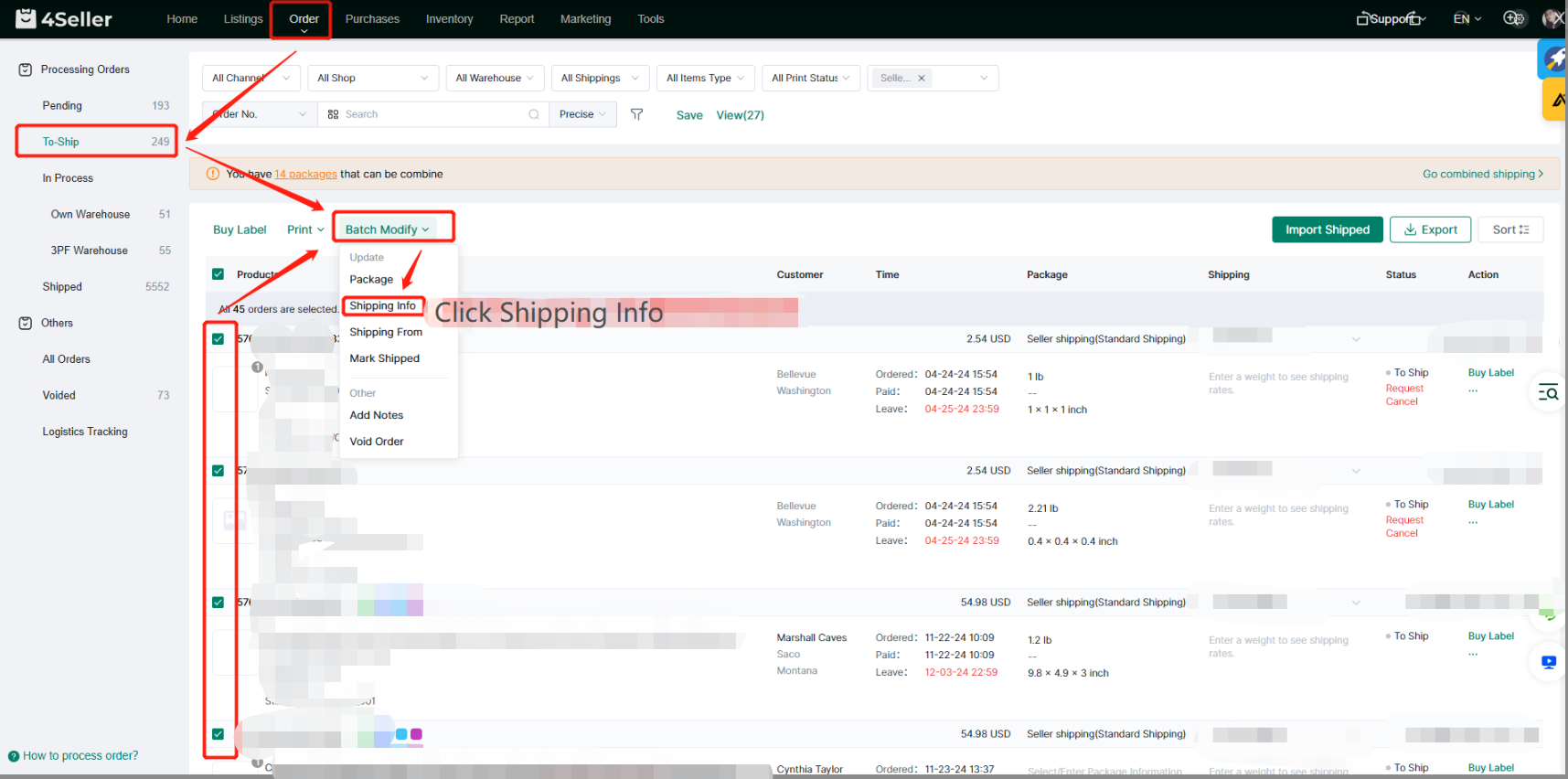 Click Shipping info in Batch Modify to batch update the logistics information of the selected orders.