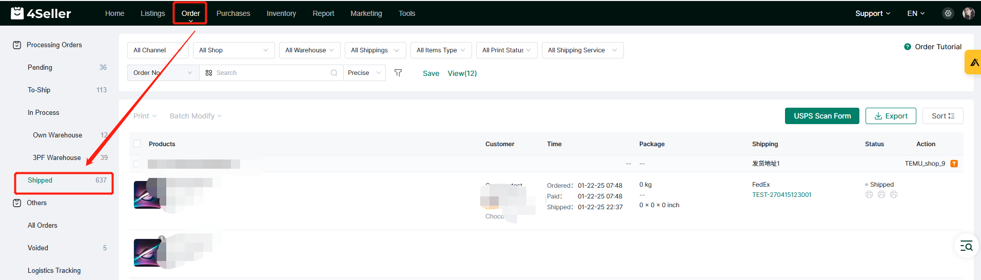 When the order is applied for with a tracking number, and the tracking number is submitted to the platform where the order is from successfully, the order will automatically enter the Shipped status.