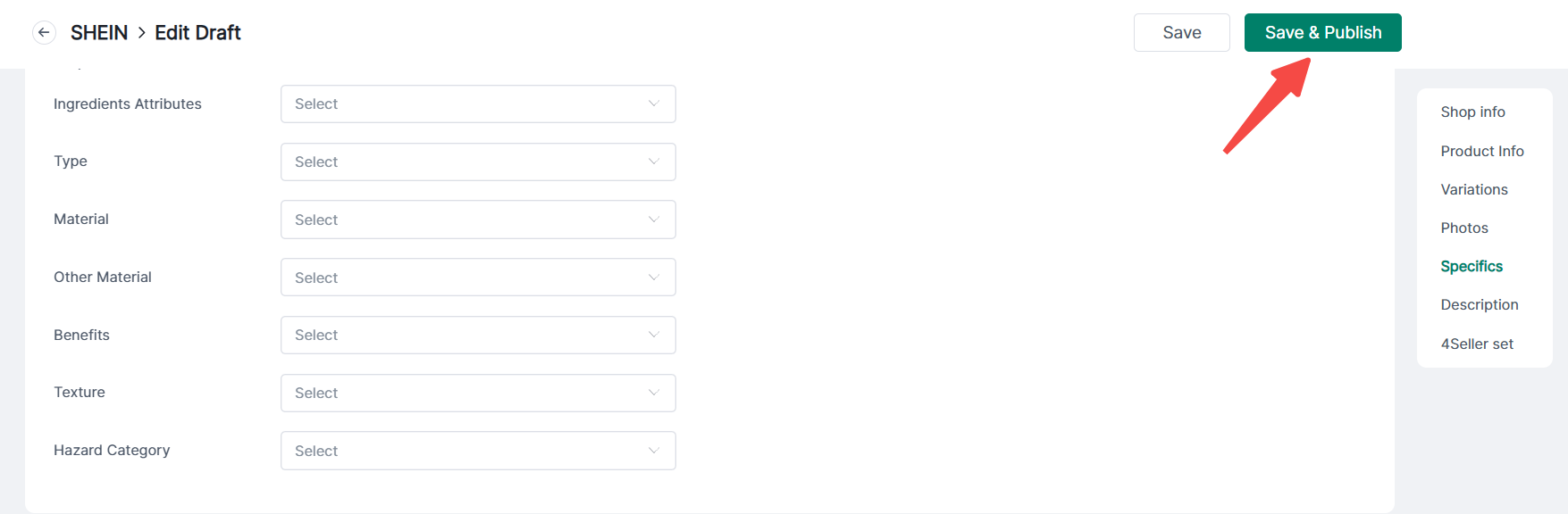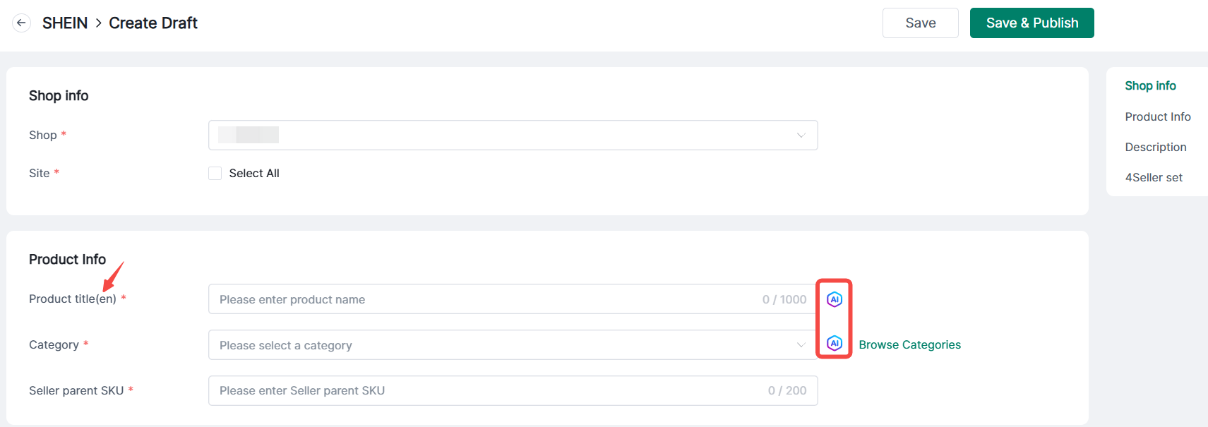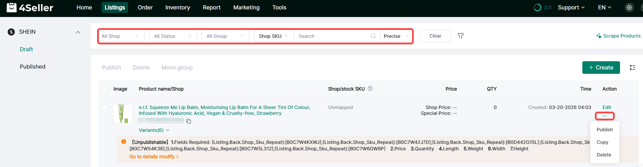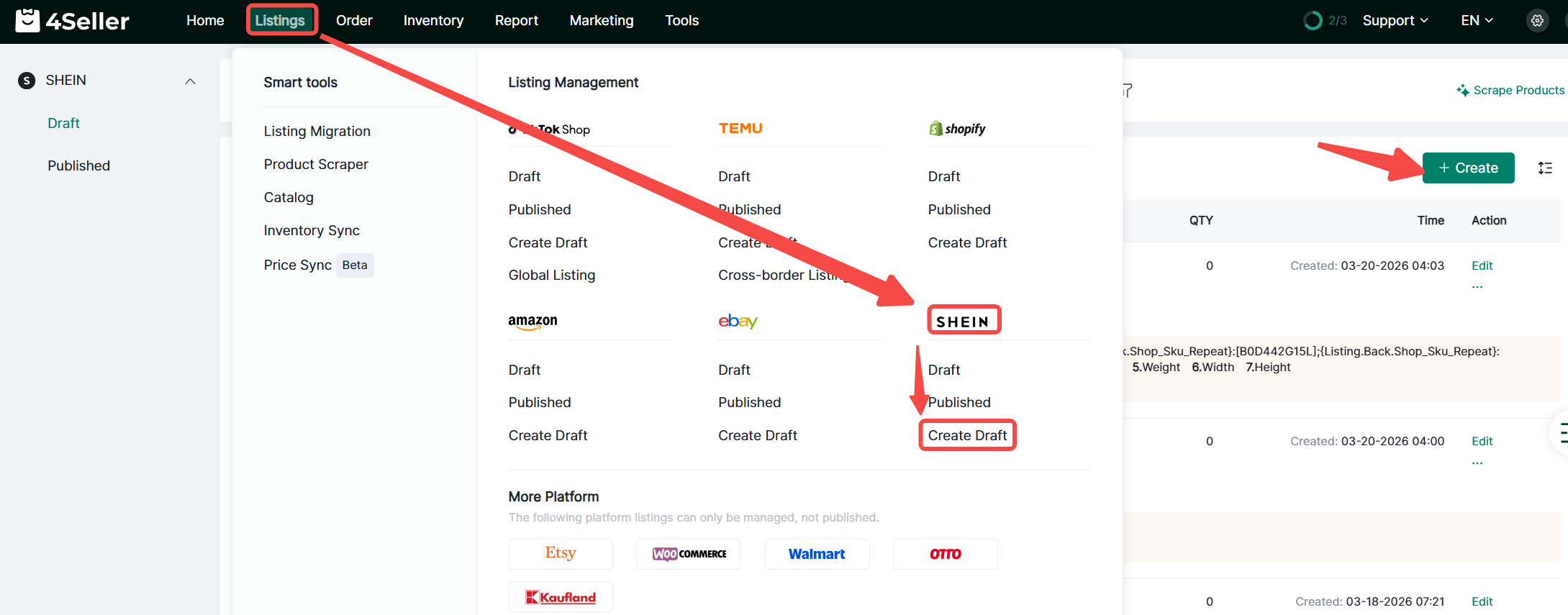 1. Click Products > SHEIN > Drafts > Create Draft, or click Create after entering the product page.