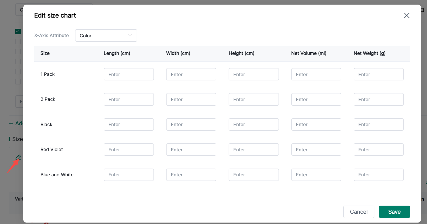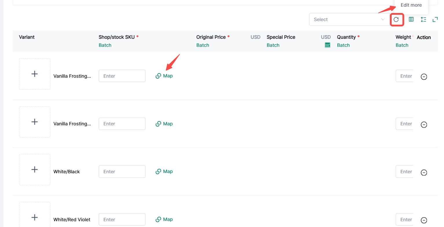④ Variants: Generate variants based on the selected variant attributes. Click “Refresh Warehouse” to fill in relevant information; you can also click “Full-Screen Edit” or use batch processing. Click “Match Inventory SKU”