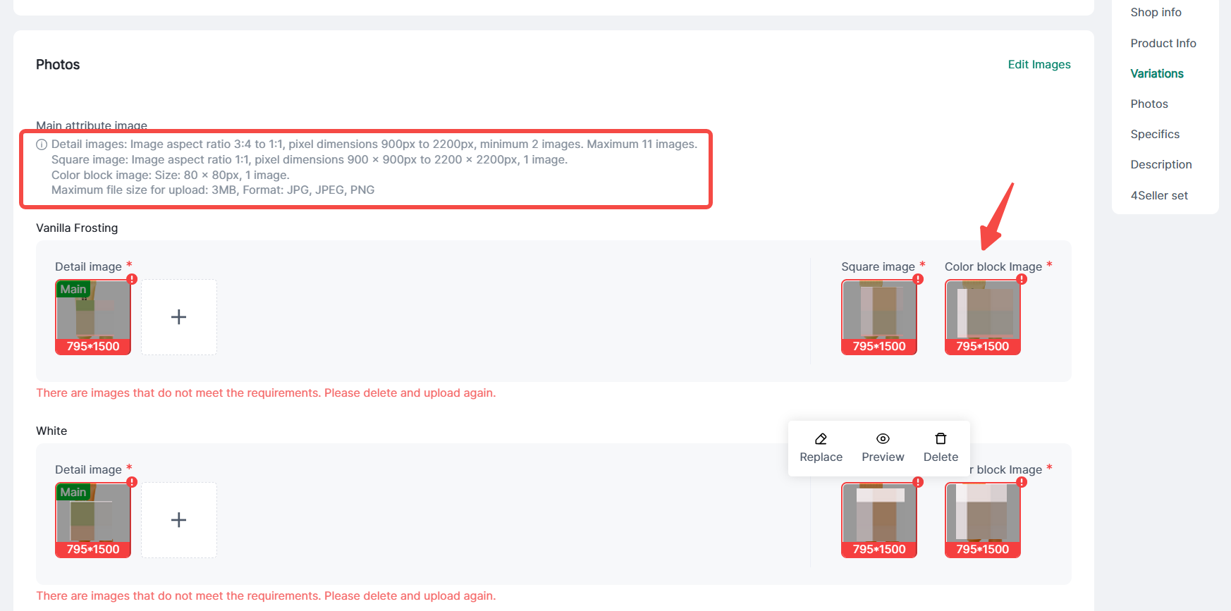 ⑤ Images: Items marked in red are required images. If the number of attributes for the main specification is ≥2, a color swatch image must be provided. Different images must be filled in according to relevant requirements. Click “Edit Images” to batch adjust image dimensions.