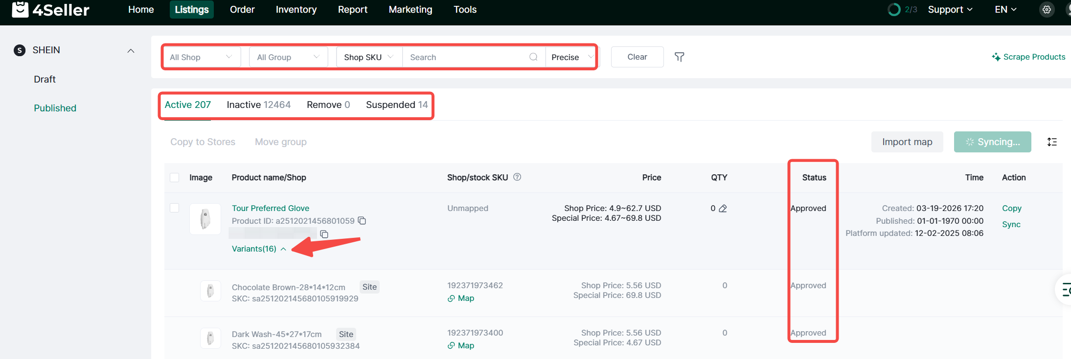 (2) After successful publication, the product will appear in the Published list. Click “Variants” to expand and view the publication status of each variant. Click ‘Copy’ to copy product information to the Drafts section, or click “Sync” to update the platform information on the list page.