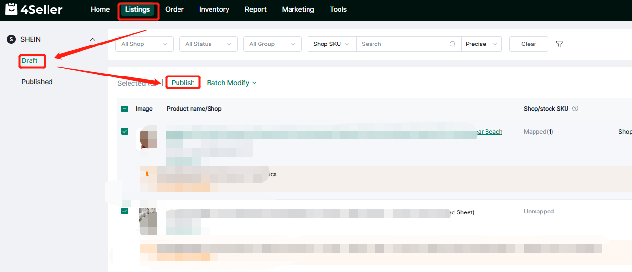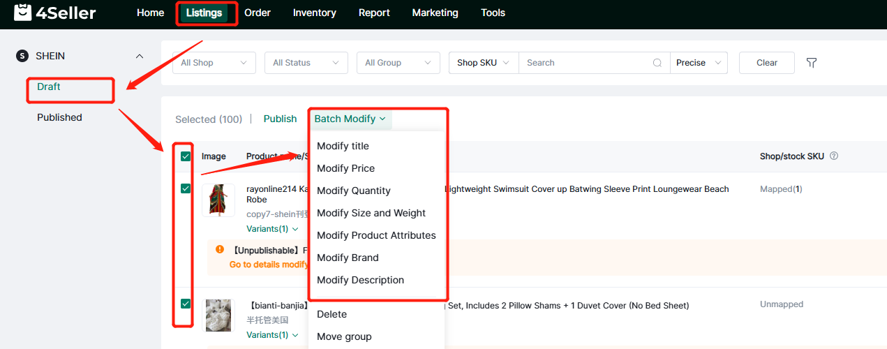1. Listing --Shein draft--Select listings--Click Batch modify--select the info to batch edit