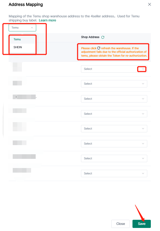 After clicking on Address mapping, an address mapping pop-up page will appear. You can click the Refresh button to update the store address on the Temu & Shein platform, select the corresponding address from the drop-down menu, and click Save to map successfully.
