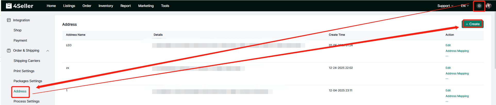 Log in to 4Seller, click on Setting - Orders & Shipping - Address, enter the address setting page, if no have address, you can set up,click" Create"