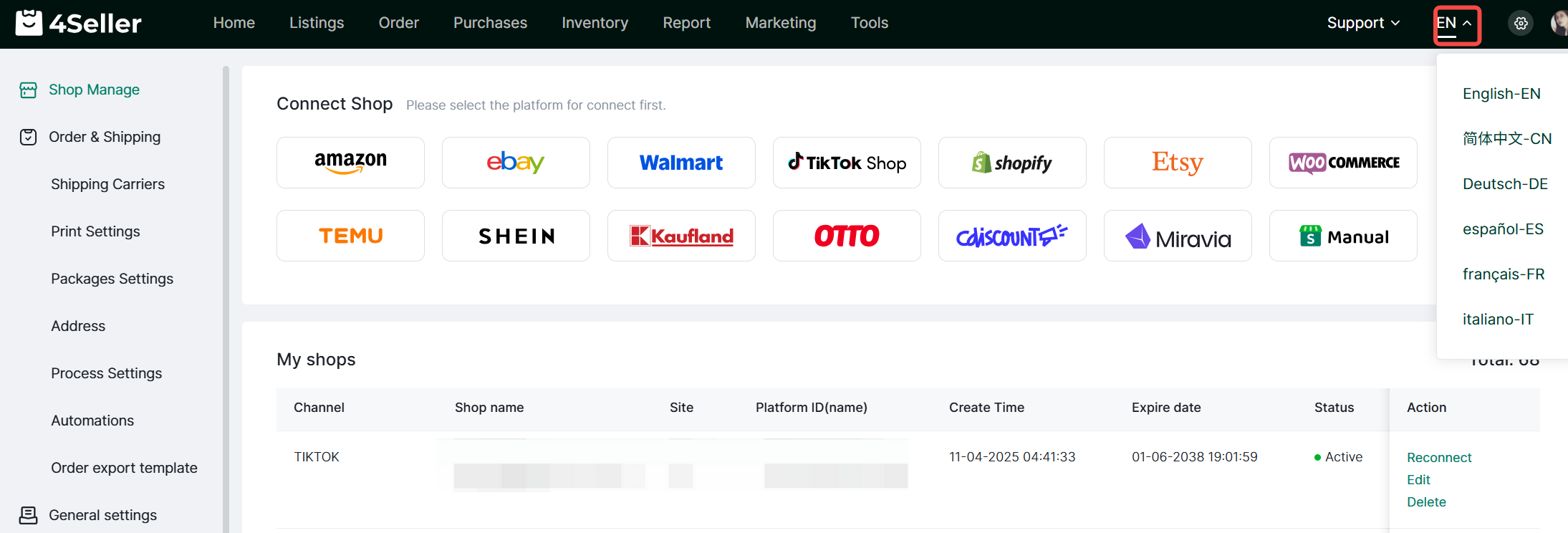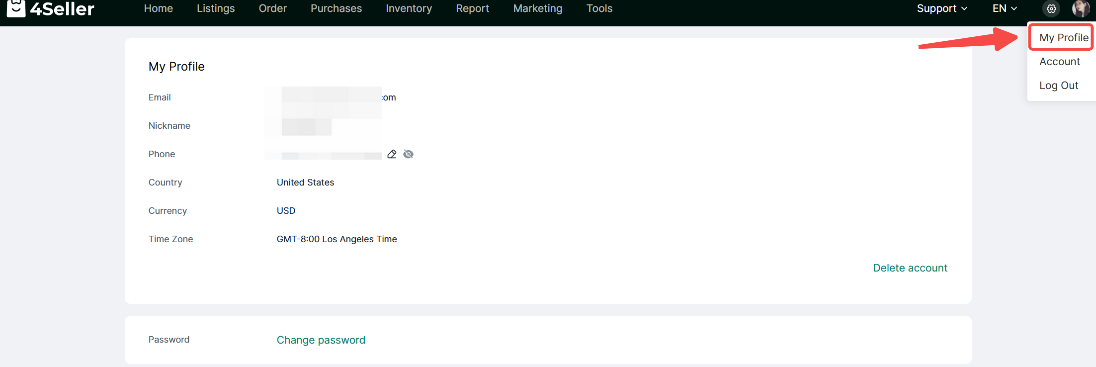 ⑥Click the profile icon in the top-right corner to access your account information (your email address is your 4Seller account ID), and to update your phone number and password.