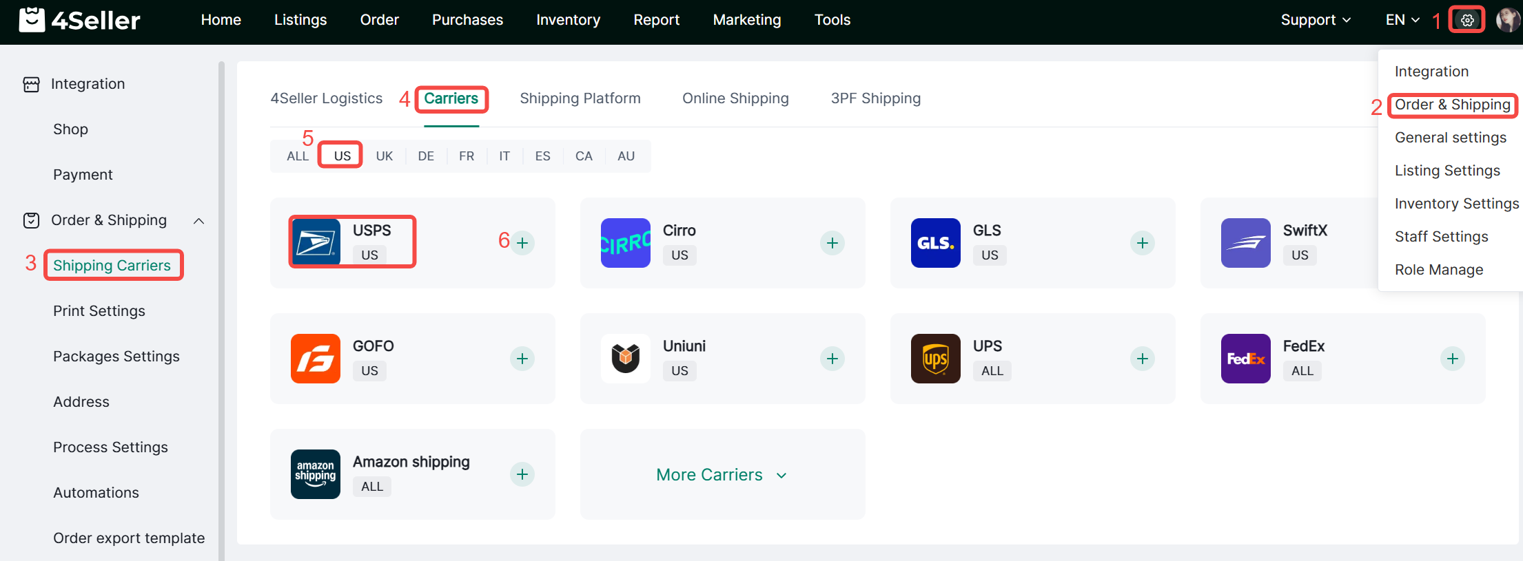 4.Log in 4Seller, click Settings-Order&Shipping-Shipping Carriers-Major Parcel Carrier-find USPS NEW and click add
