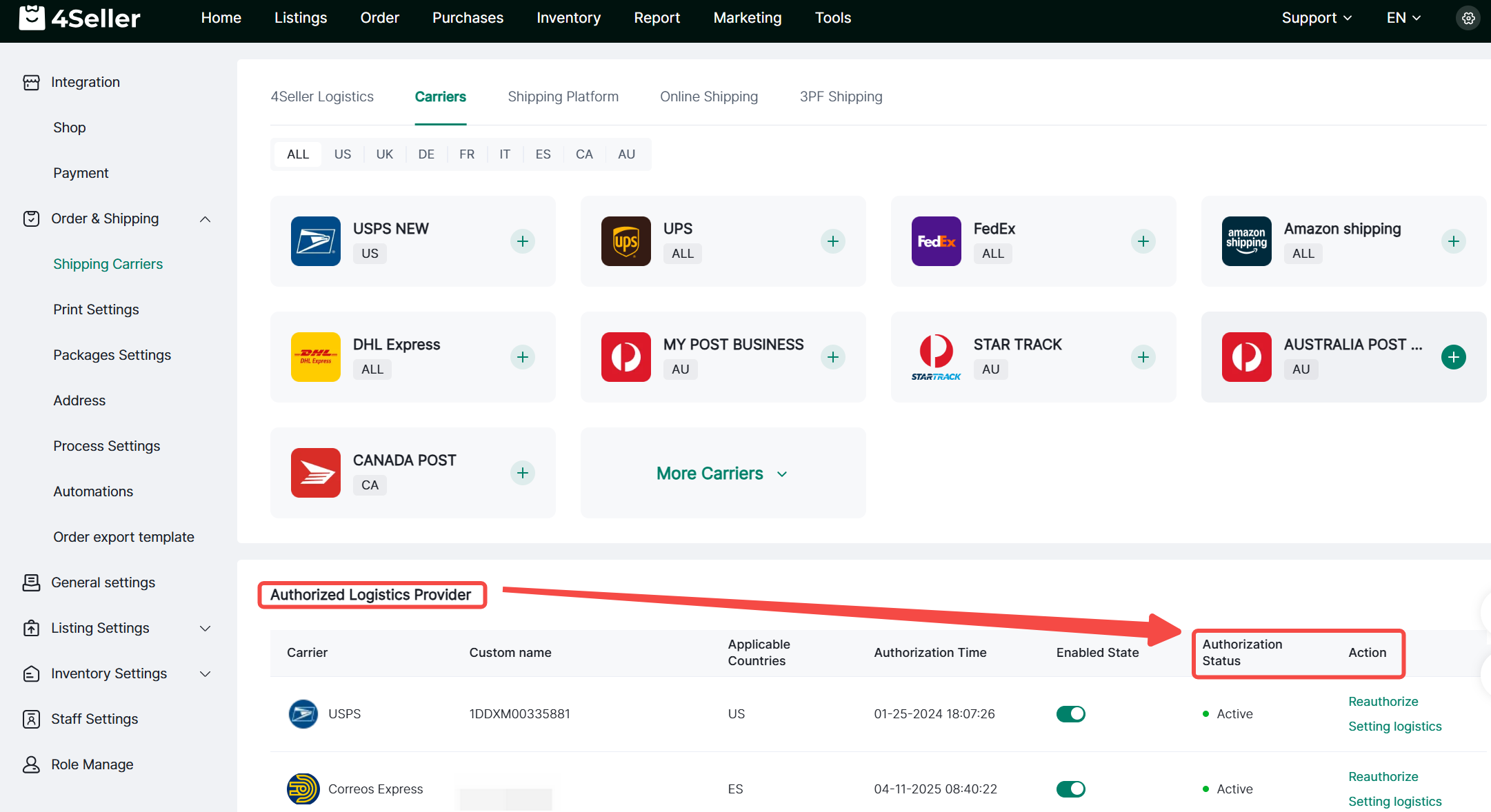 Step 4: After successful authorization, it will appear under Authorized Logistics Providers. You can check the authorization status. If it shows as inactive, click Reauthorize. You can also configure the logistics channel.