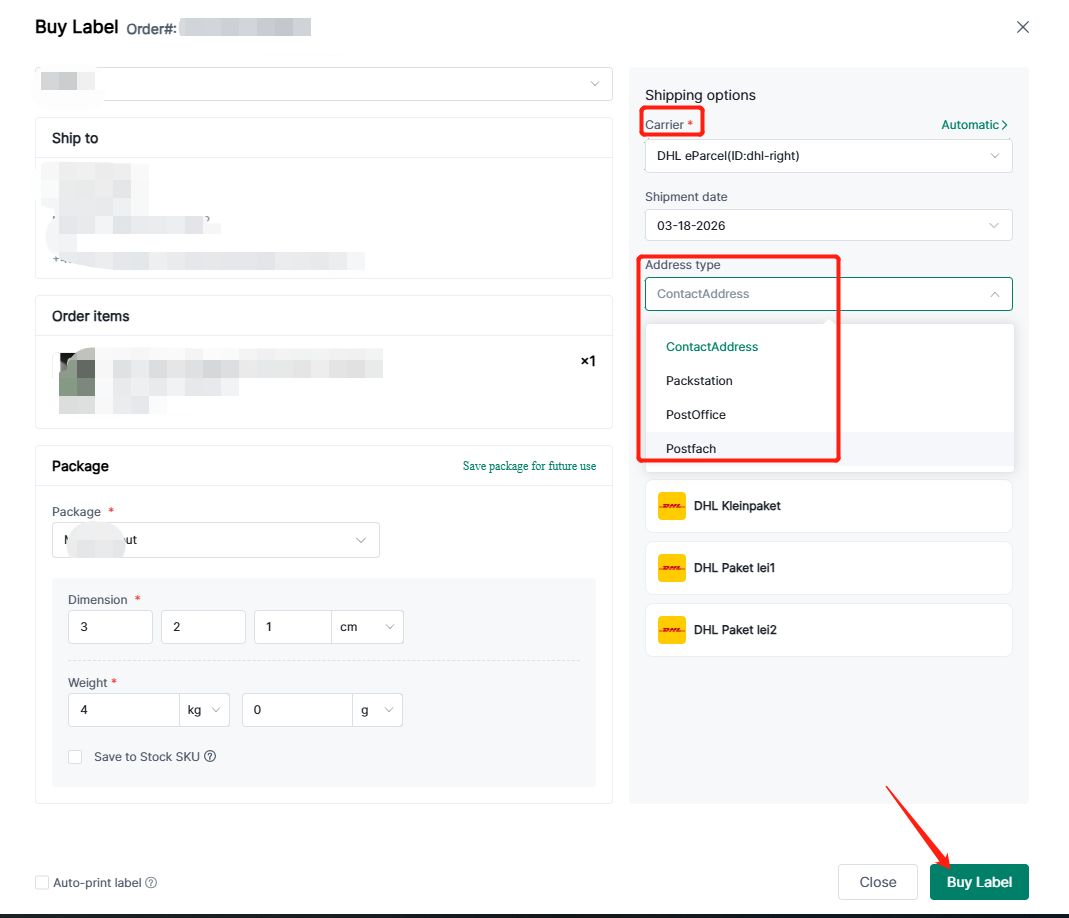 Step 3 Single Edit: Order--Buy Label--Select Address Type