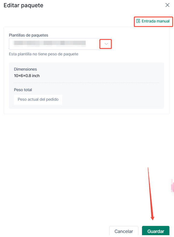 ② Haz clic en un paquete para editar: Ingresa peso, dimensiones (manual o predefinidas) > Guardar.