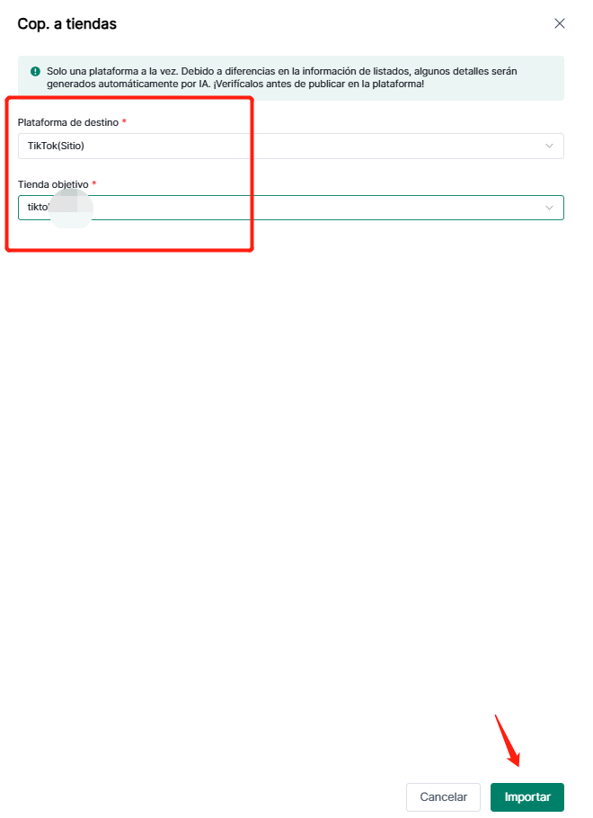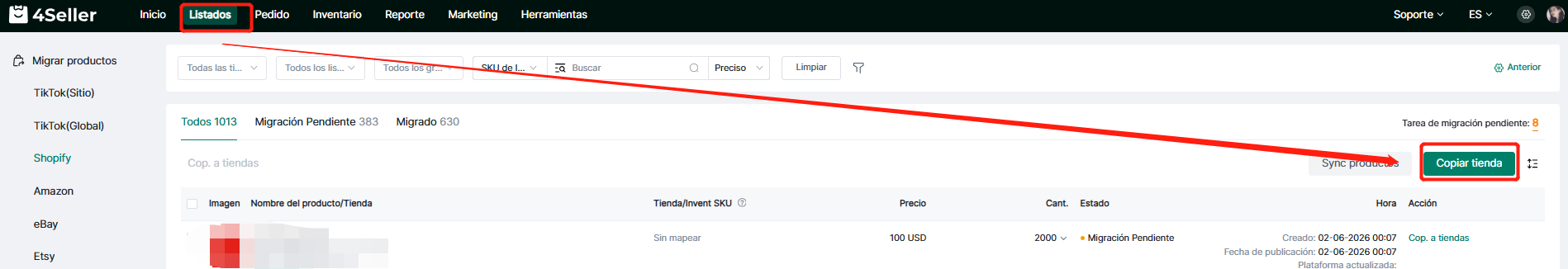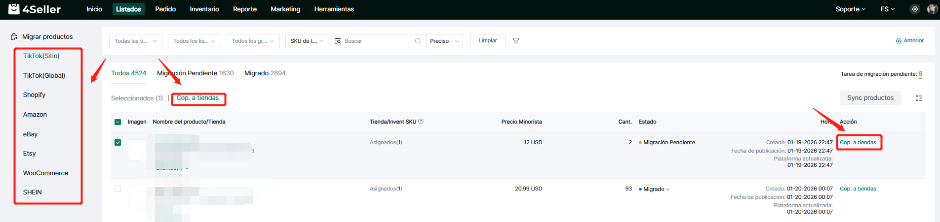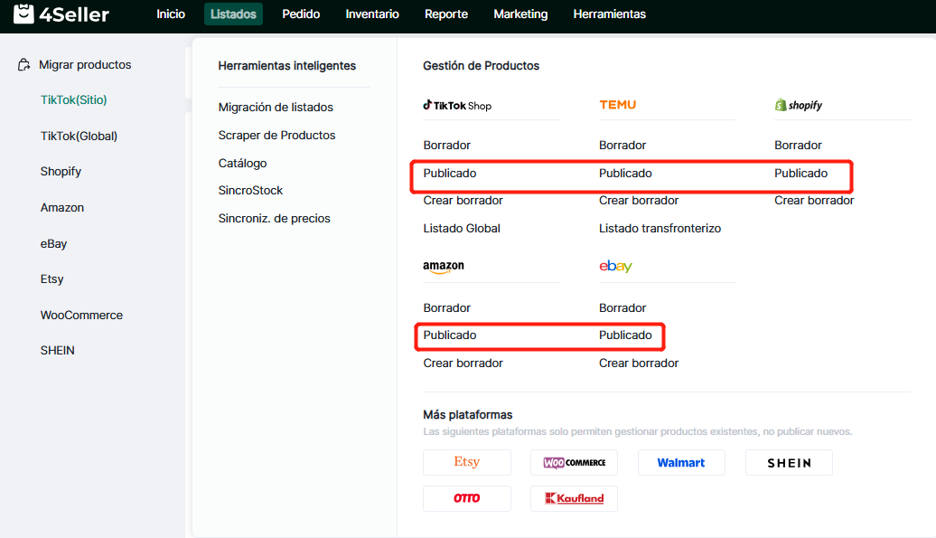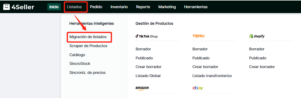 4Seller permite migrar productos de Shopify, Amazon, TikTok, eBay, Etsy, WooCommerce y SheIn para publicarlos en TikTok. Este proceso implica copiar y pegar; los datos originales de la tienda no se eliminarán.