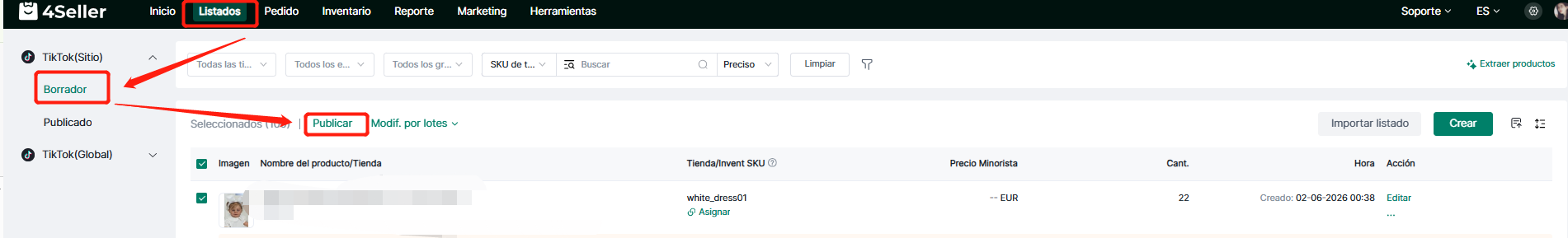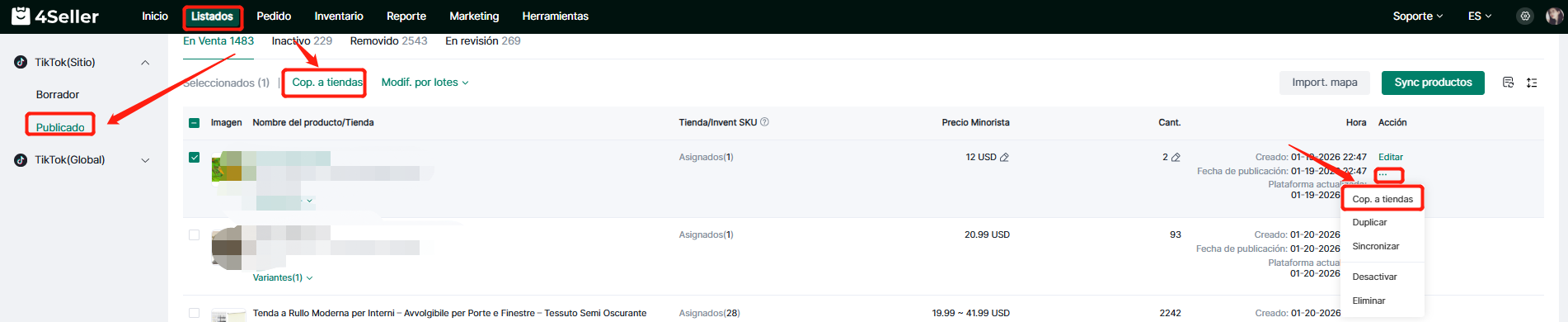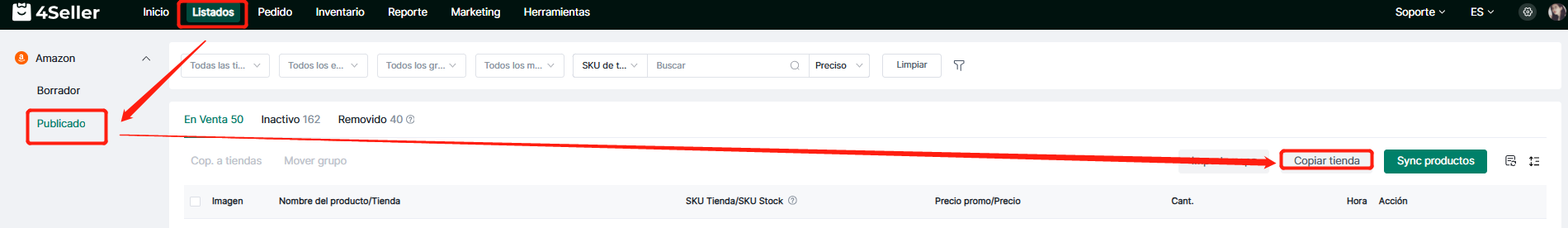 ① Haga clic en Listados → Acceda a la página de productos publicados de la plataforma correspondiente