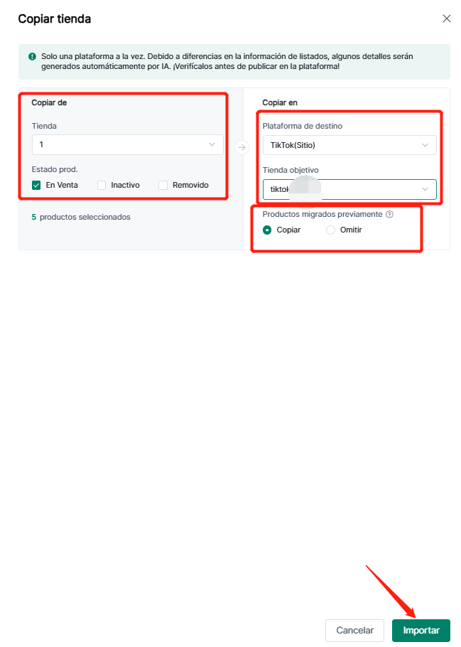 (2) Copiar tienda: seleccione los estados del producto y si desea omitir los artículos migrados previamente