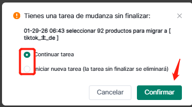 Nota: Solo se puede ejecutar una tarea de migración por tienda simultáneamente. Si hay alguna tarea sin finalizar, aparecerá una ventana emergente. Elija entre continuar la tarea existente o iniciar una nueva (las tareas sin finalizar se eliminarán). Confirme después de seleccionar.