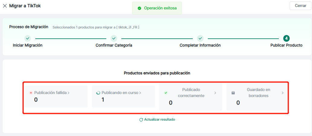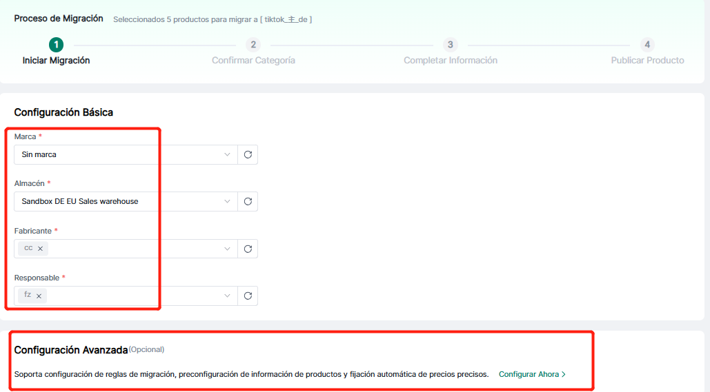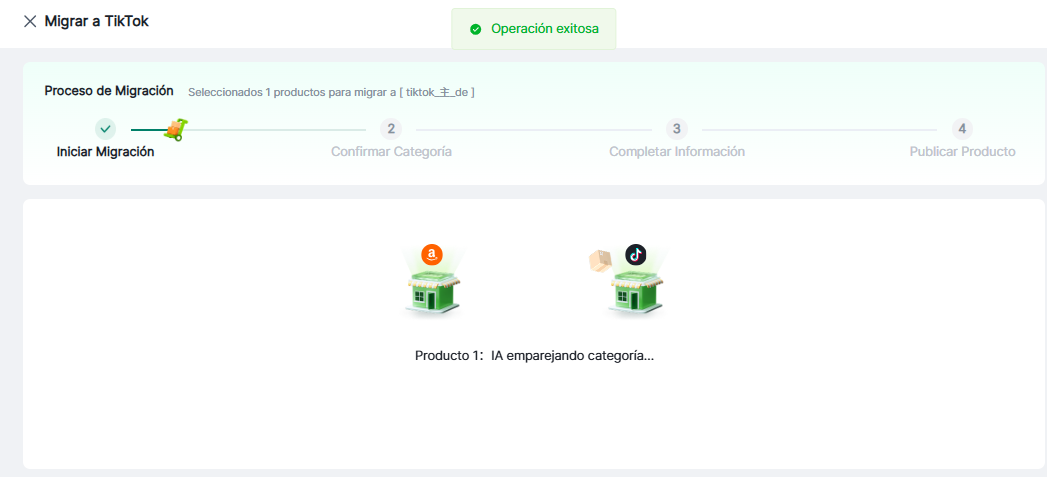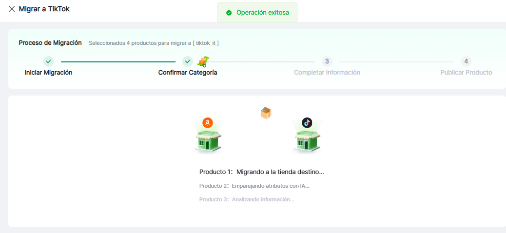 El flujo de trabajo de migración consta de 4 pasos: Iniciar migración → Confirmar categorías → Completar información → Publicar productos. Estos pasos están diseñados para optimizar la publicación; los productos se publican directamente en la plataforma una vez finalizado.