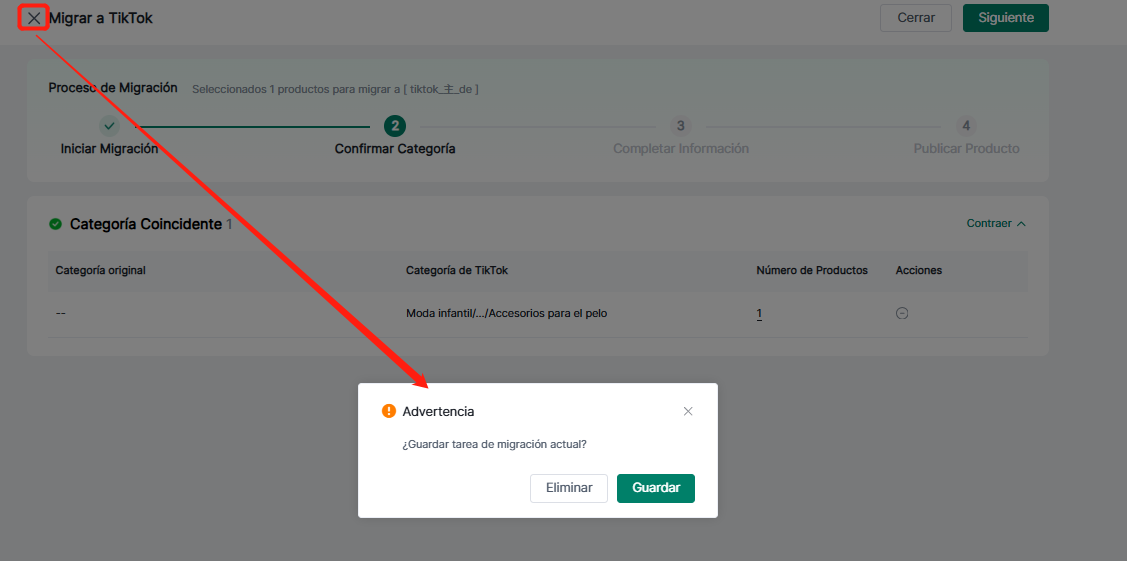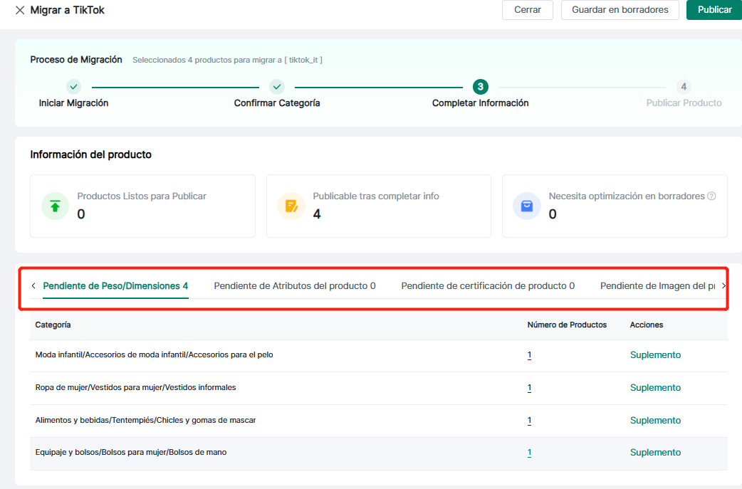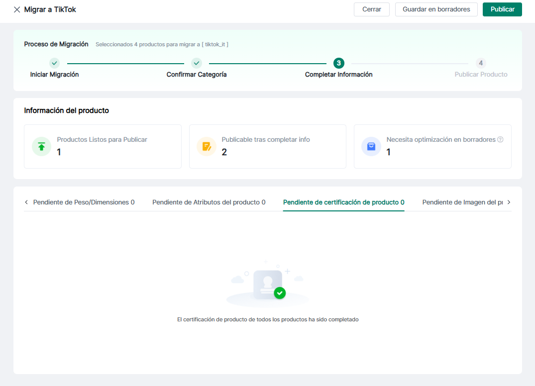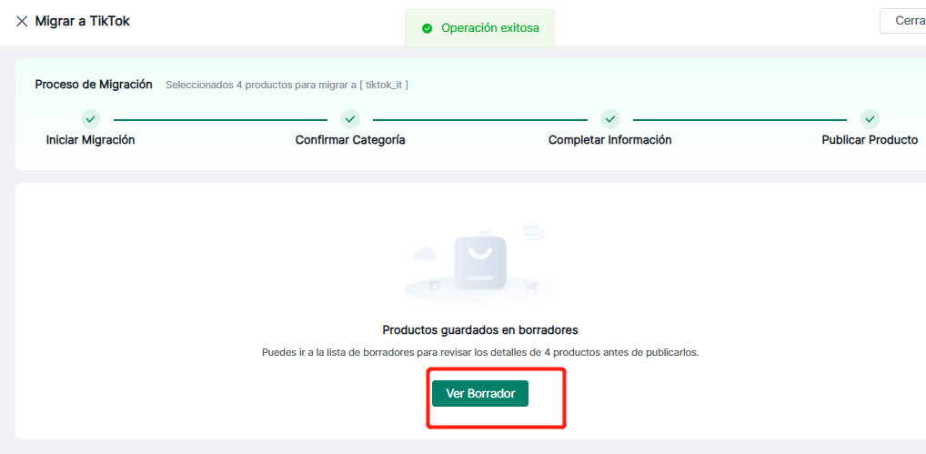 3. Guardar como borrador: Haga clic en "Ver borrador" para ir a la sección de borradores, donde se muestran los productos guardados durante este proceso de migración.