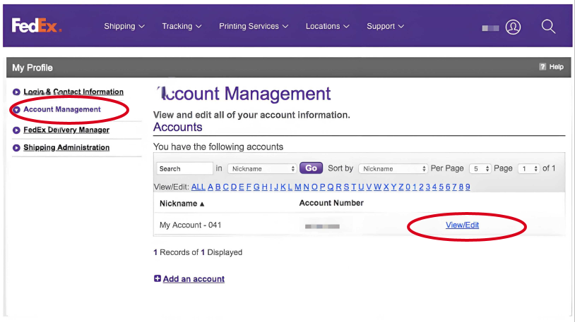 Inicia sesión en FedEx → "Mi perfil" → "Gestión de cuentas" → Datos en sección derecha.