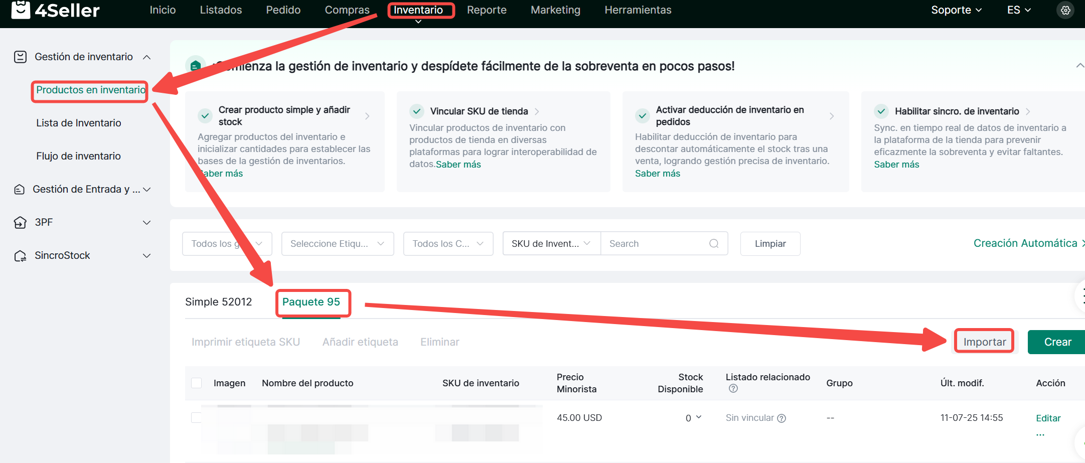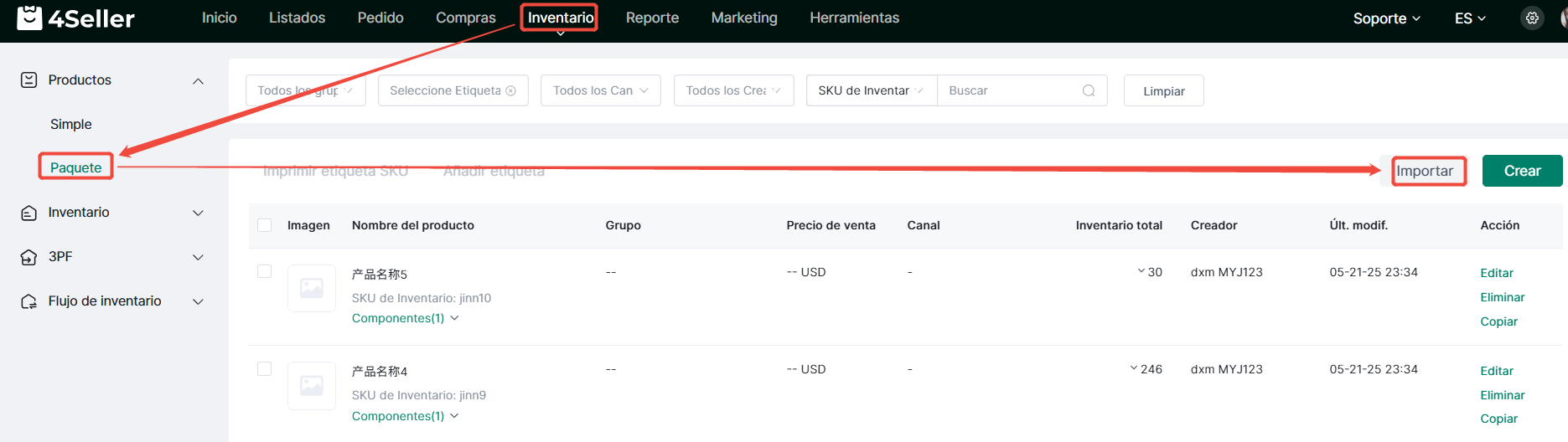 1. Haga clic en Inventario-Productos-Paquete-Importar.