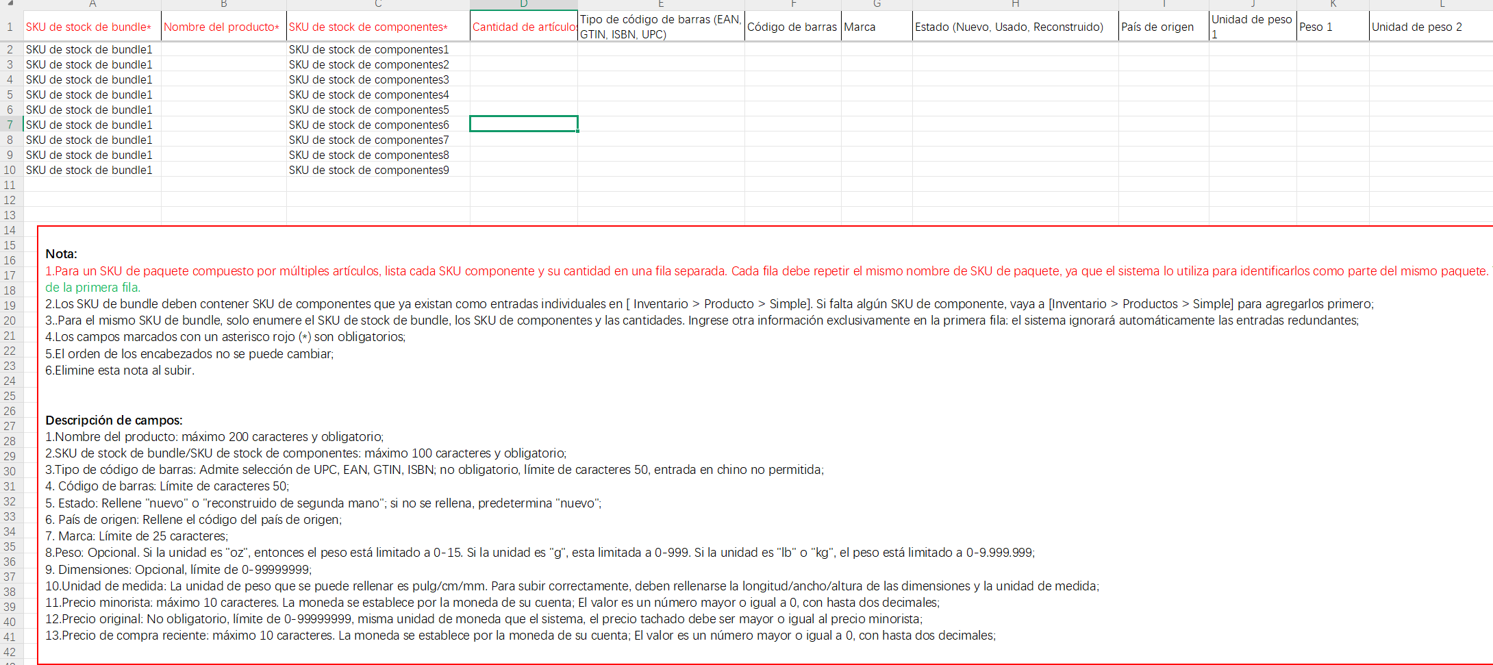 3. Cada idioma tiene su formulario correspondiente.Revise los ejemplos antes de completar. Un SKU combinado formado por múltiples artículos debe completarse en varias líneas. Como se muestra en la siguiente figura