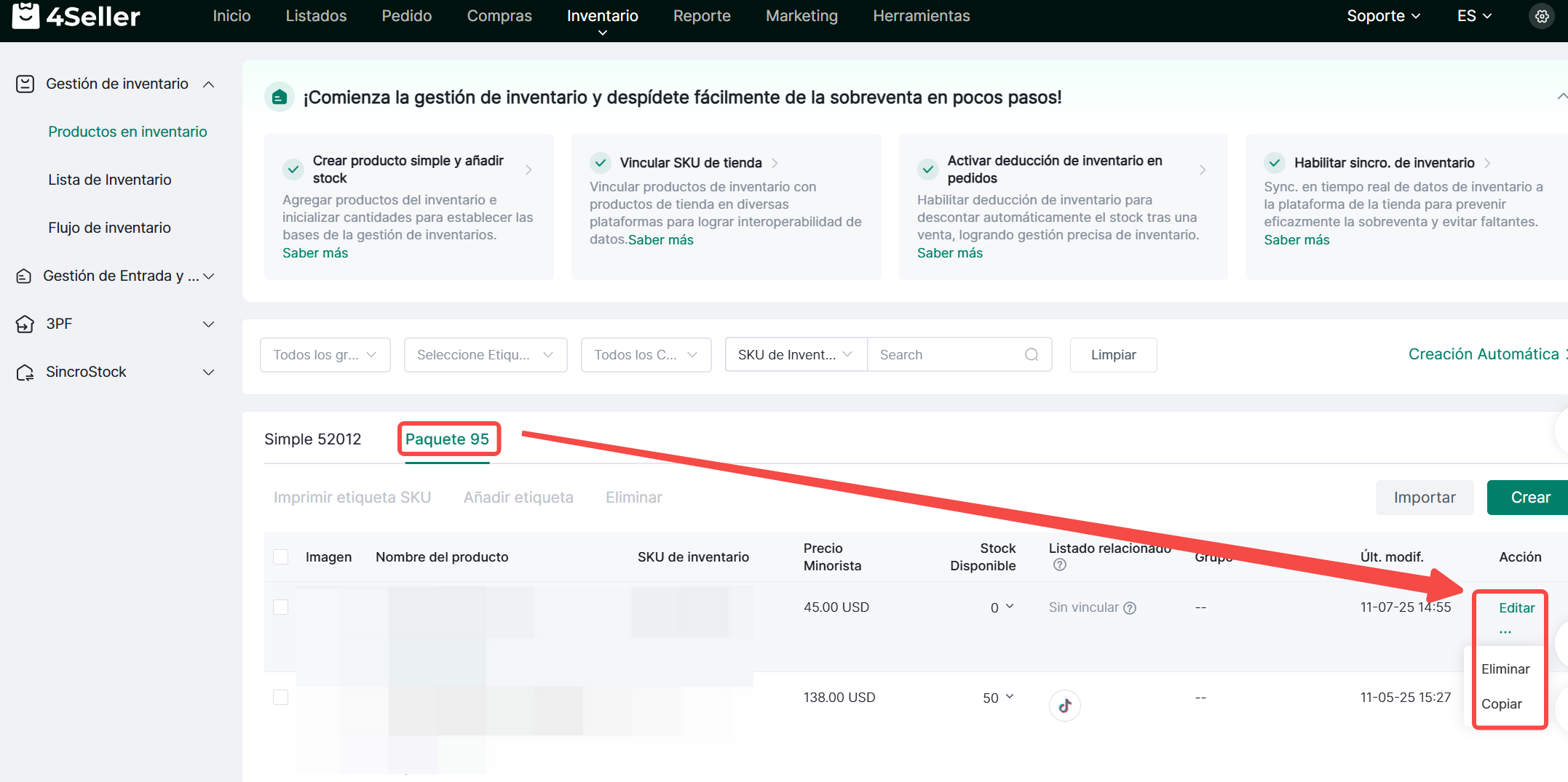 5. Los productos combinados importados aparecerán listados. Podrá editar, eliminar o copiar los artículos.