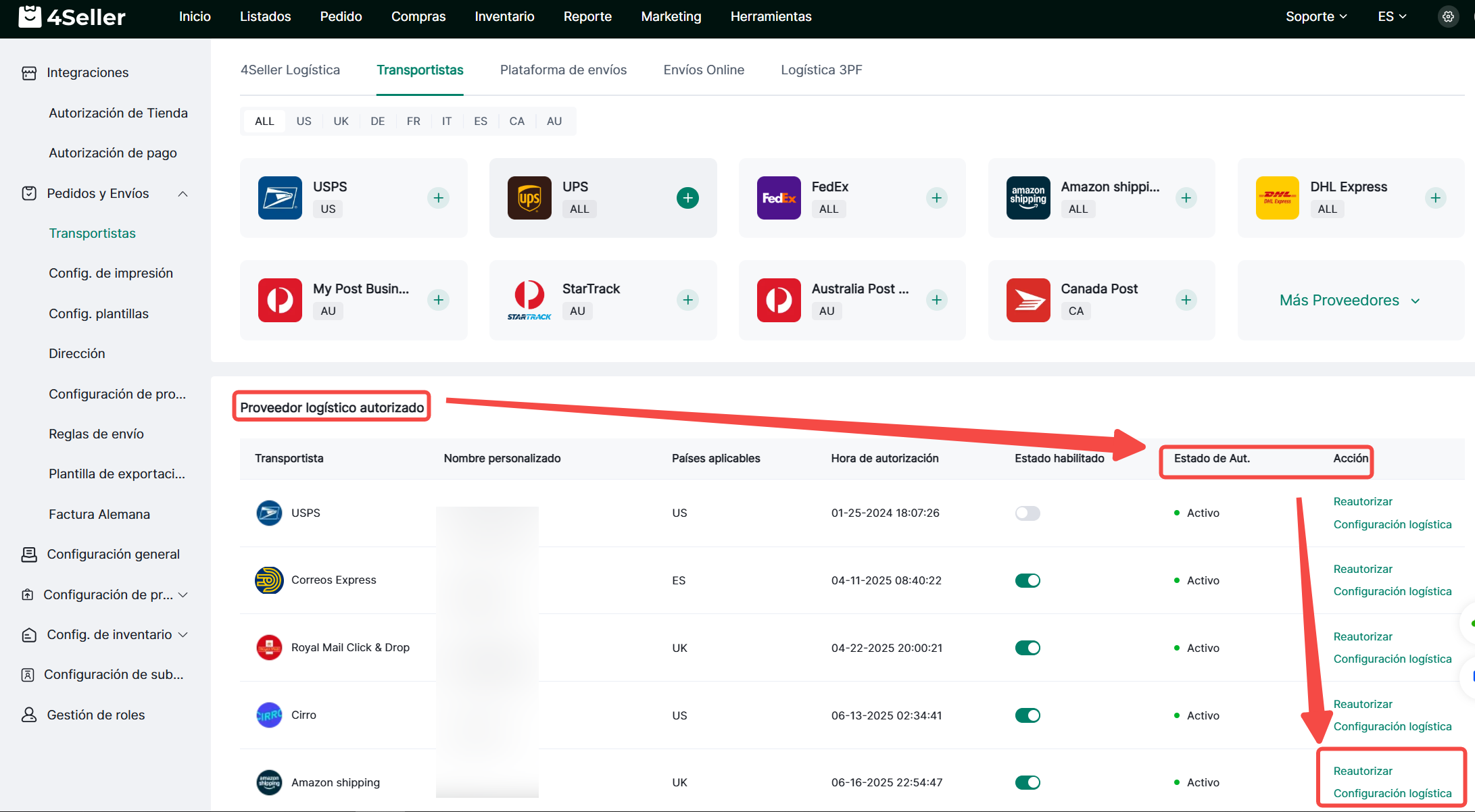 3. Tras la autorización exitosa, podrás ver y configurar el estado del proveedor logístico autorizado, así como reautorizar y configurar el canal de logística.
