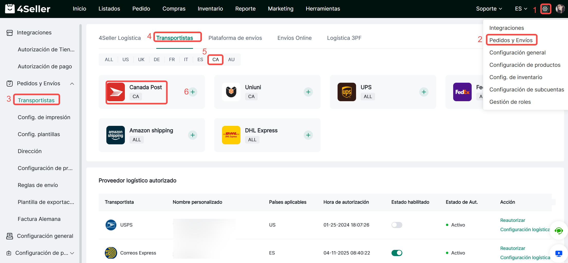 3. Tras la autorización exitosa, podrá ver el proveedor logístico autorizado en la lista, con opciones para activar/desactivar, reautorizar y configurar canales logísticos.