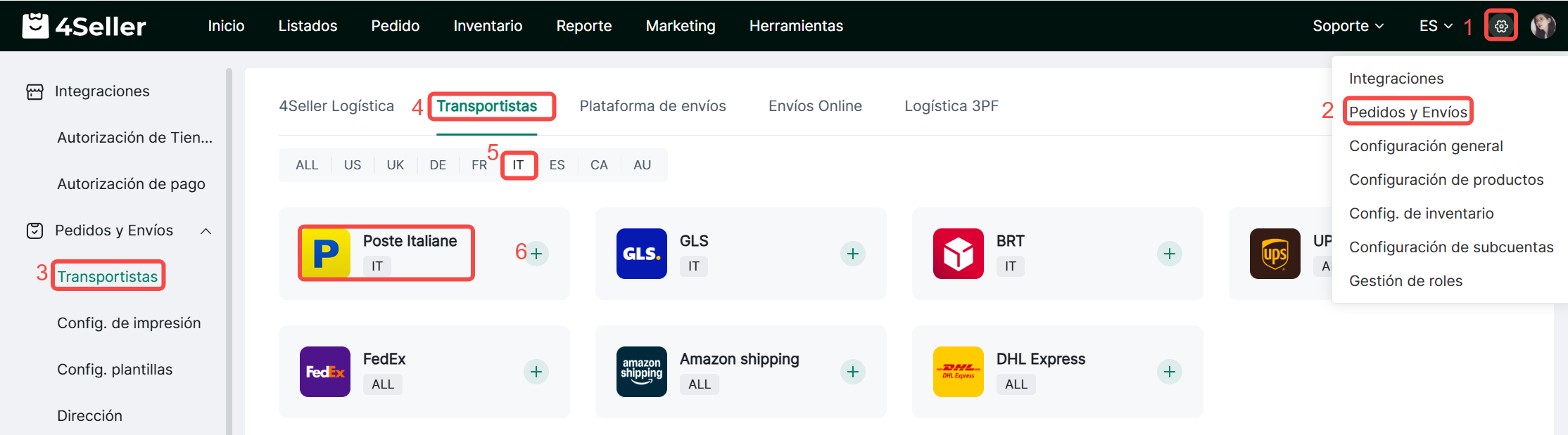 1、Haz clic en Configuración-Pedidos & Envíos-Transportistas-Transportistas principales-Busca el icono correspondiente-Haz clic en ‘+’.