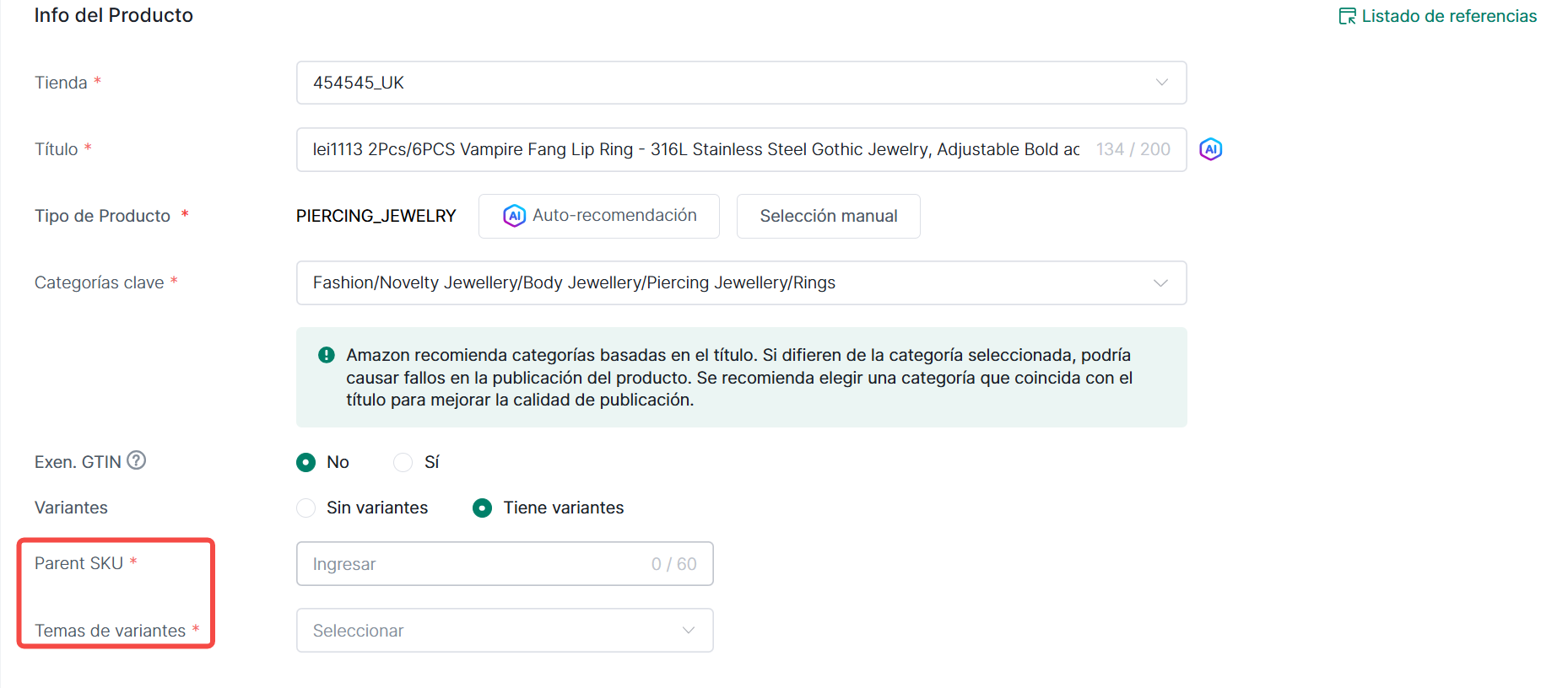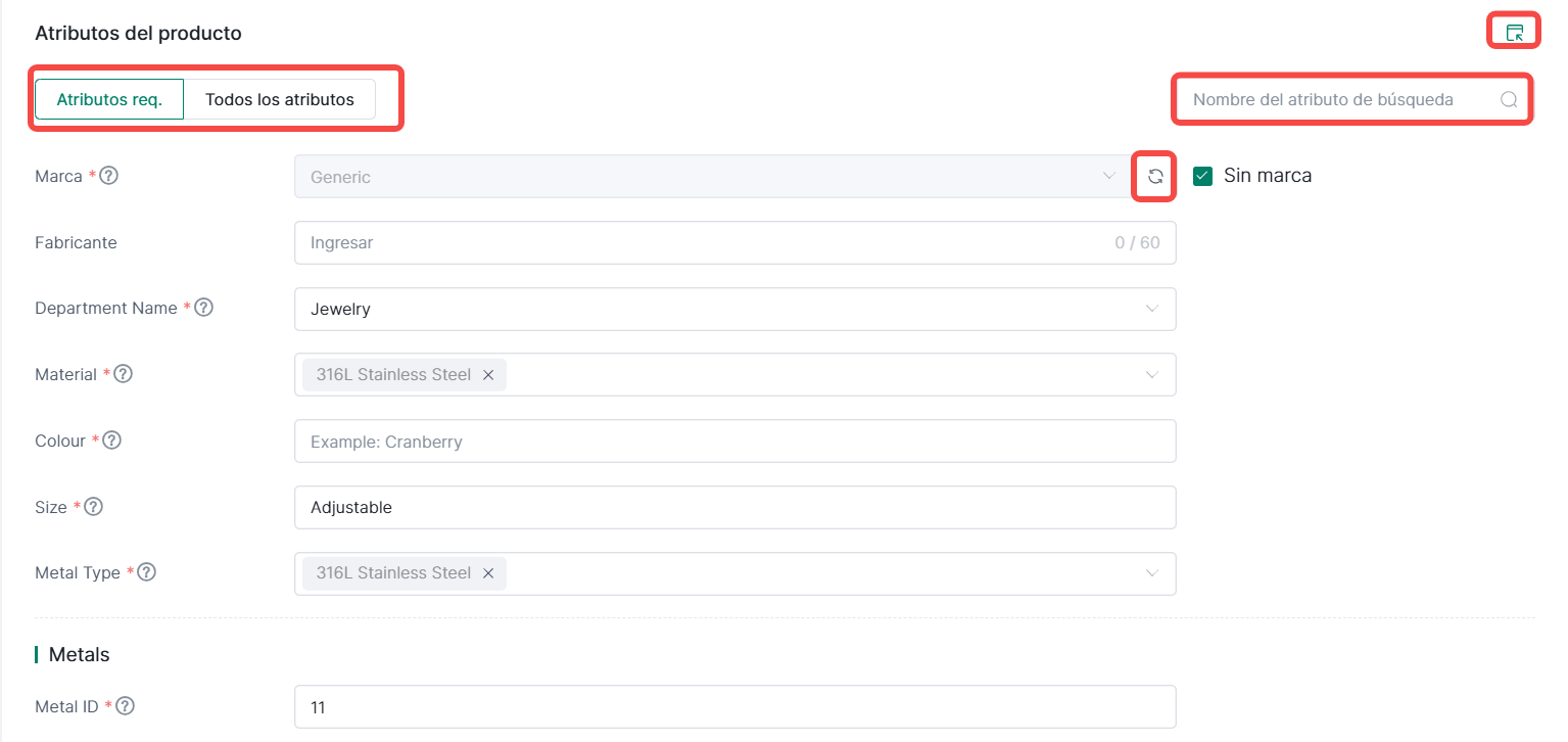 Nota: La información de la marca se sincroniza con la información del backend de Amazon. Si el producto no tiene marca, seleccione "Sin marca" para reemplazarlo automáticamente por "Genérico".