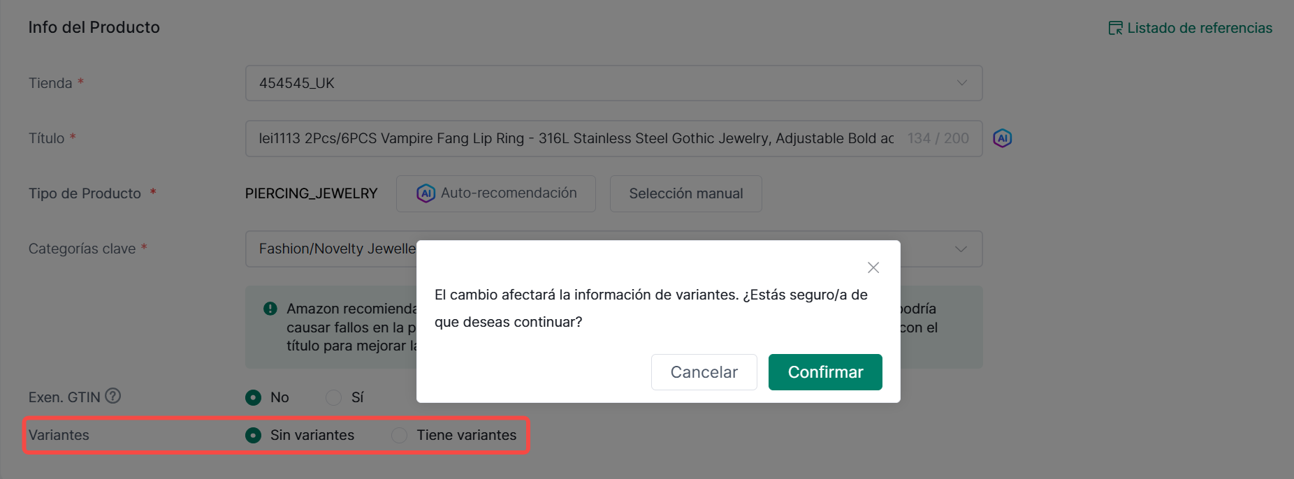 En el campo del módulo de información del producto, puede seleccionar "Sin variación" o "Con variaciones". Al cambiar el tipo de variación, la información de la variación original se verá afectada. Puede confirmar el cambio.