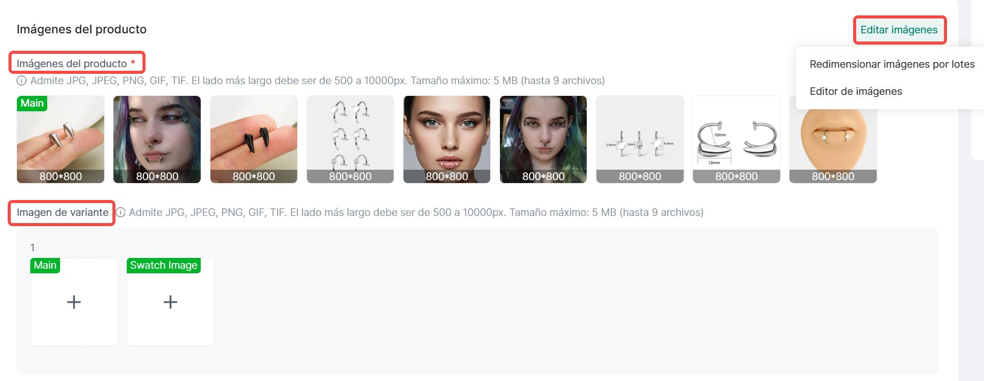 (2) Imágenes variantes: Compatible con los formatos JPG, JPEG, GIF y TIF. Se pueden cargar hasta 9 imágenes.
