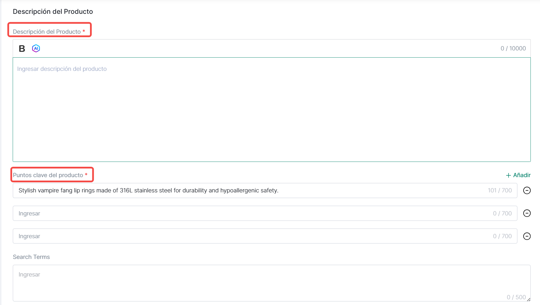 (1) Imágenes del producto: Compatible con los formatos JPG, JPEG, GIF y TIF. Se pueden cargar hasta 9 imágenes.