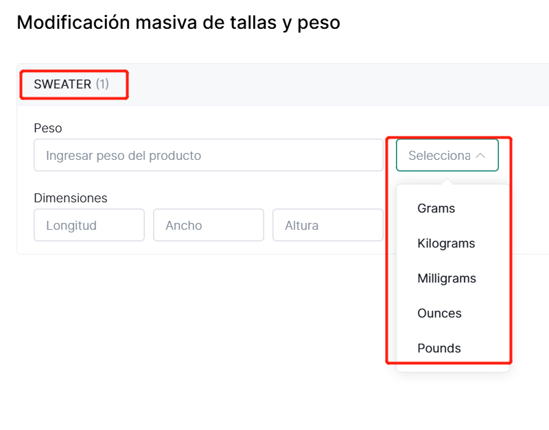 (2) Cada categoría mostrará las unidades de peso y dimensión correspondientes.