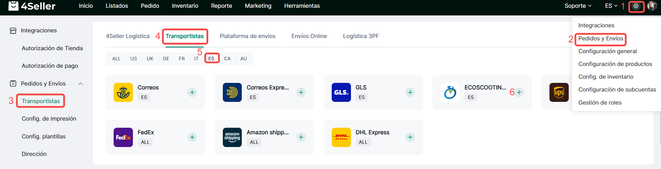 1. Haga clic en Configuración - Pedidos y Envíos - Proveedores Logísticos - Transportistas - Busque el icono correspondiente - Haga clic en ‘+’.